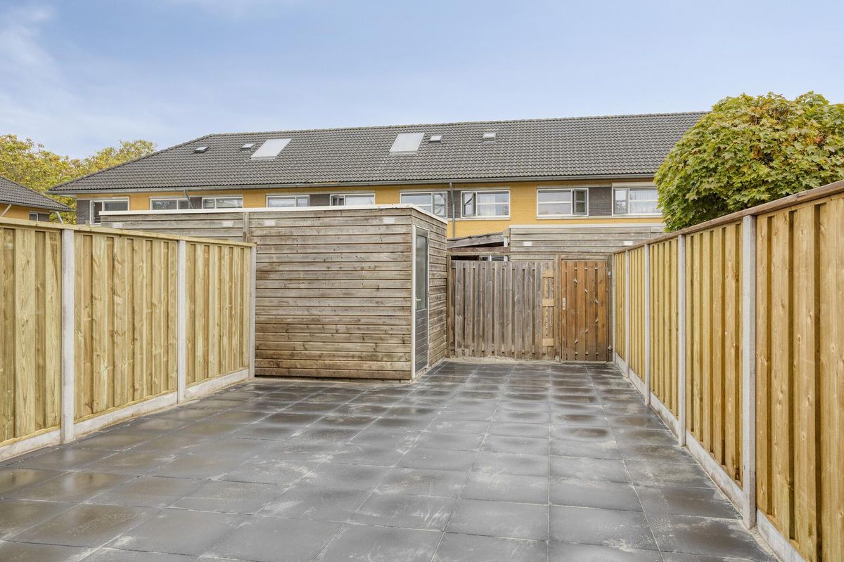 Een ruime, onderhoudsarme tuin gericht op het noorden met berging en achterom. Door de diepte van de tuin is er gedurende het grootste deel van het jaar volop zon.