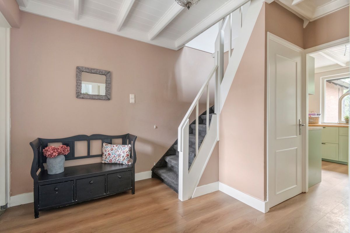 De keuken is voorzien van groene kastfronten in combinatie met het houten werkblad geven het geheel een landelijke, maar eigentijdse uitstraling. De keuken is uitgerust met diverse inbouwapparatuur, waaronder een gasfornuis met oven, een combi-oven, een quooker-kraan, inbouwkoelkast en vaatwasser. Dankzij het raam dat uitkijkt op de tuin is er prettig veel lichtinval en een fijn zicht op het groen rondom de woning.