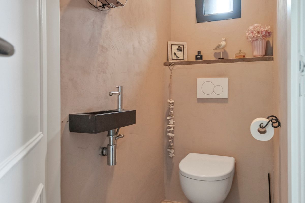 Via de entree van de woning kom je binnen in de ontvangsthal, die toegang biedt tot het toilet, de trapopgang naar de eerste verdieping en de keuken. Het toilet is strak afgewerkt en voorzien van een landelijke tegelvloer met warme tinten.