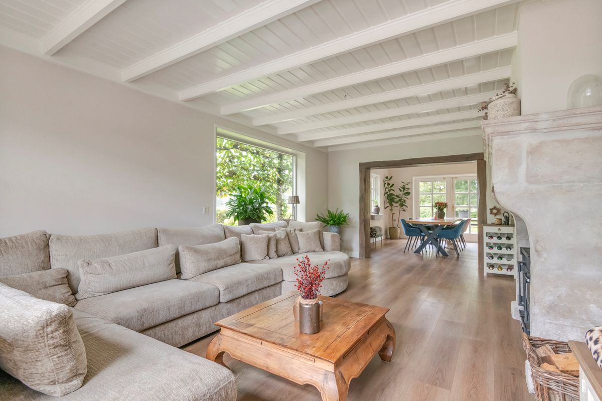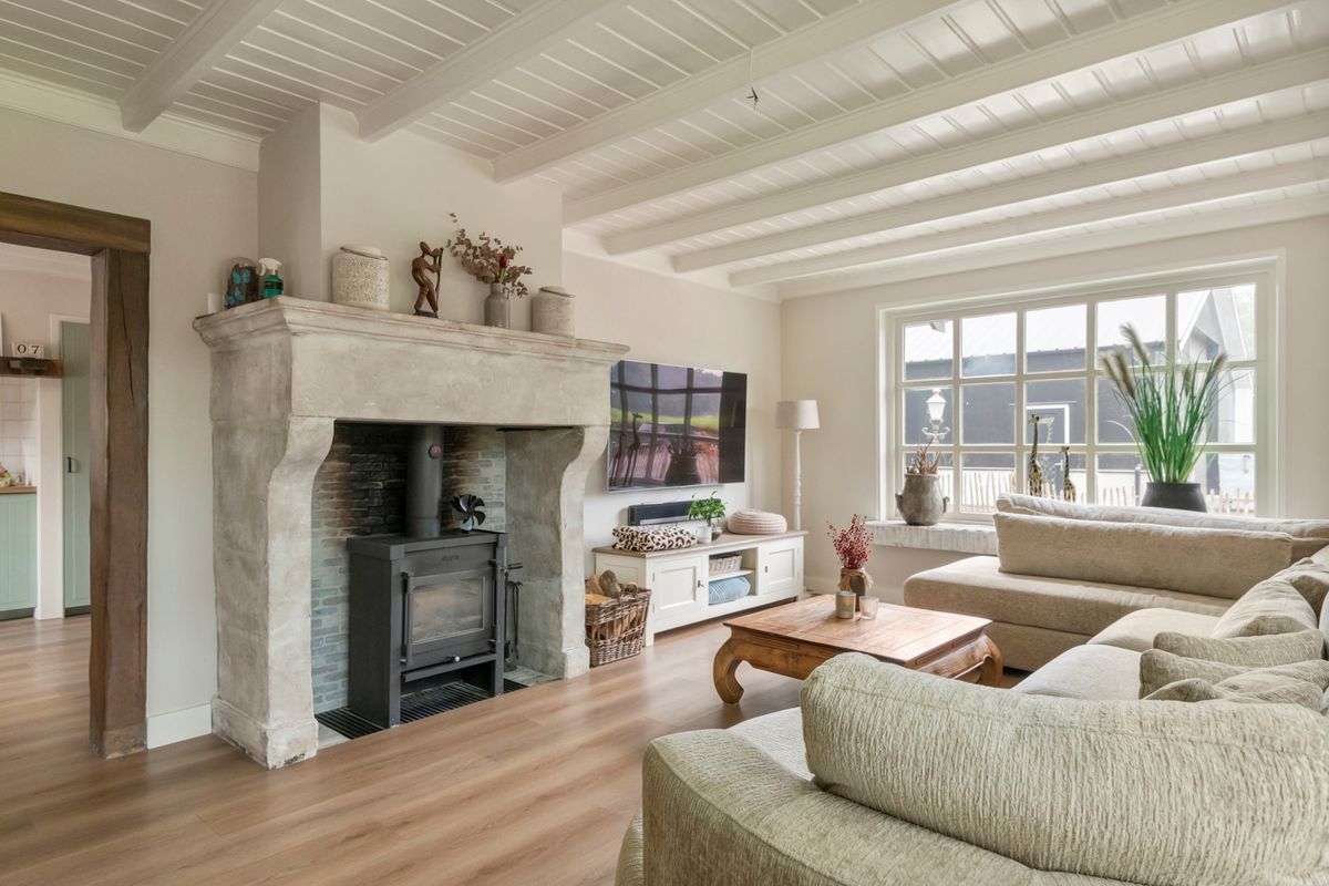 Tussen de keuken en woonkamer vormen de robuuste houten balken een sfeervolle doorkijk en zorgen ze voor een warme verbinding tussen de ruimtes. De woonkamer zelf is licht en uitnodigend, met een balkenplafond dat bijdraagt aan het landelijke karakter. De blikvanger is de prachtige schouw met houtkachel, die niet alleen sfeer maar ook behaaglijke warmte brengt op de koudere dagen.