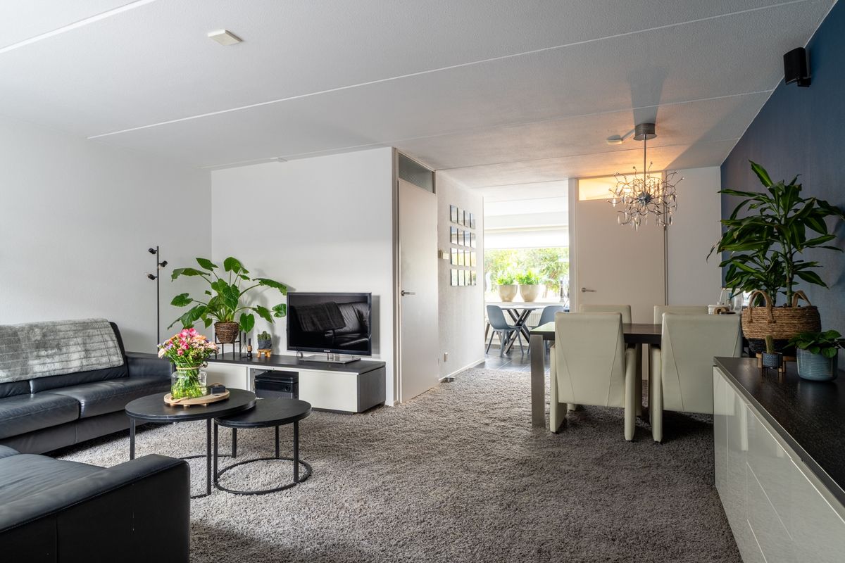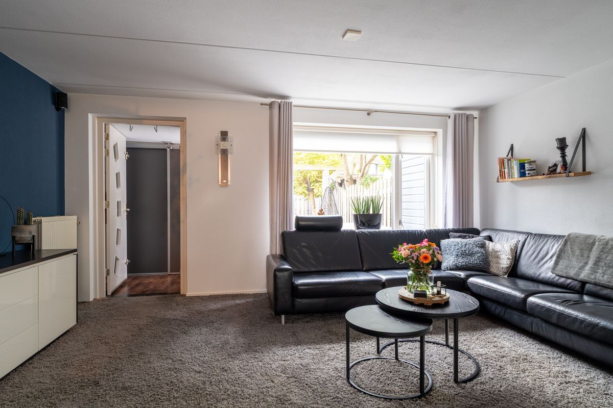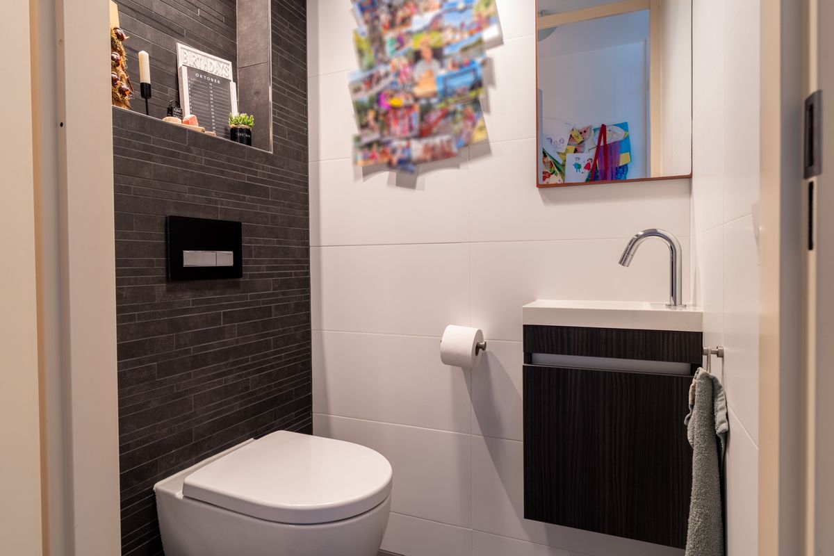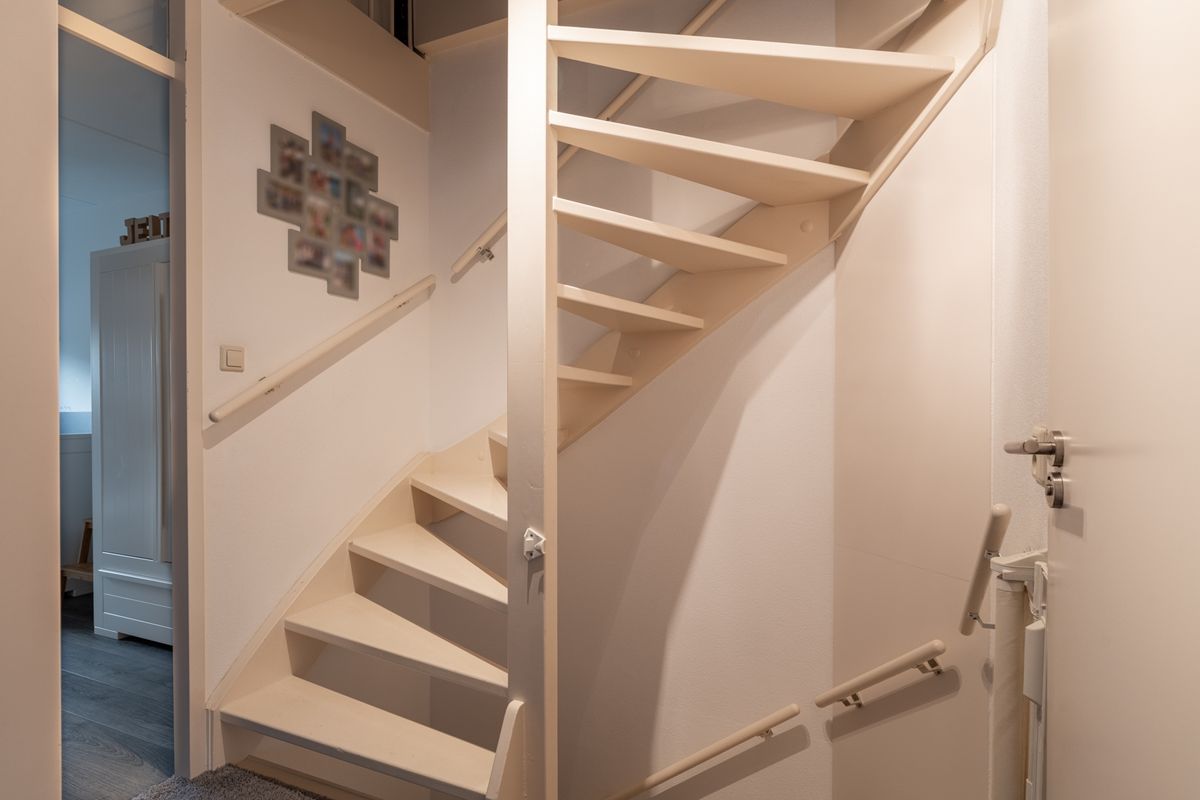 Je komt binnen via de voordeur in de hal. Vanuit hier loop je door naar de woonkamer, waar je meteen de ruimte en het licht ervaart. Via een tussenportaal vind je de trap naar boven én een modern, fris toilet.