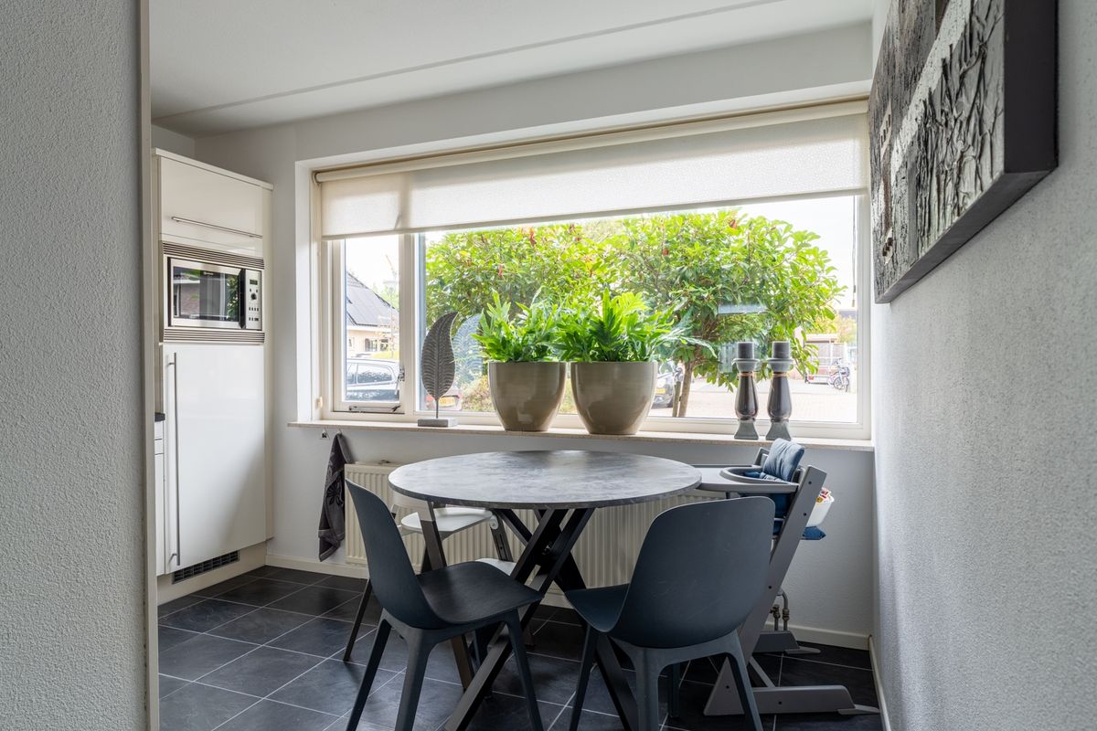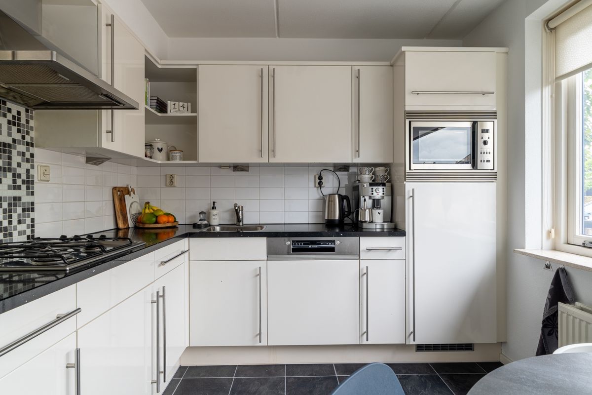 Wat een fijne plek: de knusse woonkeuken aan de voorzijde van de woning is perfect voor een gezellig ontbijt of een snelle kop koffie. De keuken is opgesteld in een hoek en uitgerust met o.a. een 4-pits gaskookplaat, schouw, vaatwasser, combimagnetron en koelkast. Achterin de woning vind je de bijkeuken met schuifwandkast – ideaal voor voorraad of schoonmaakspullen.