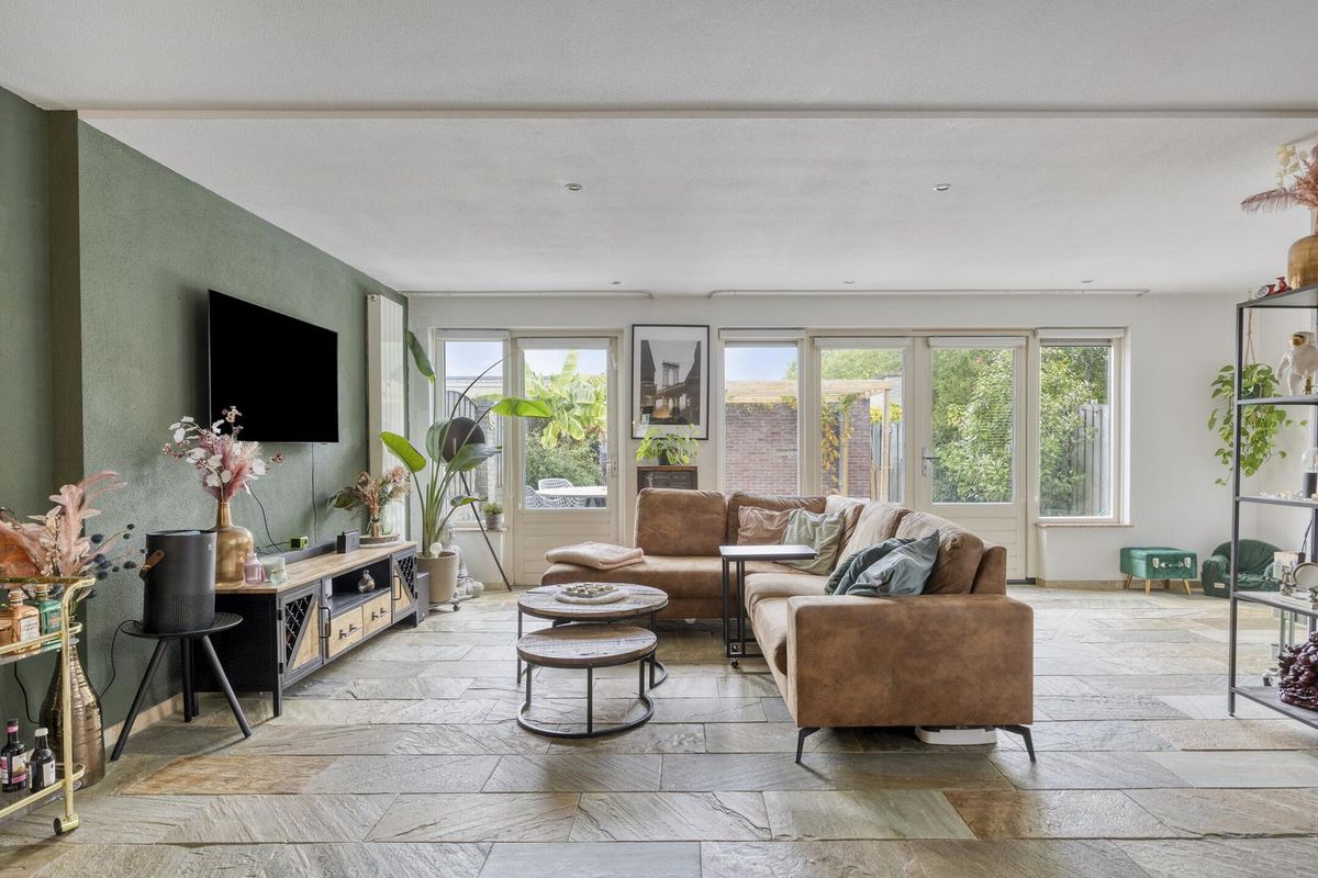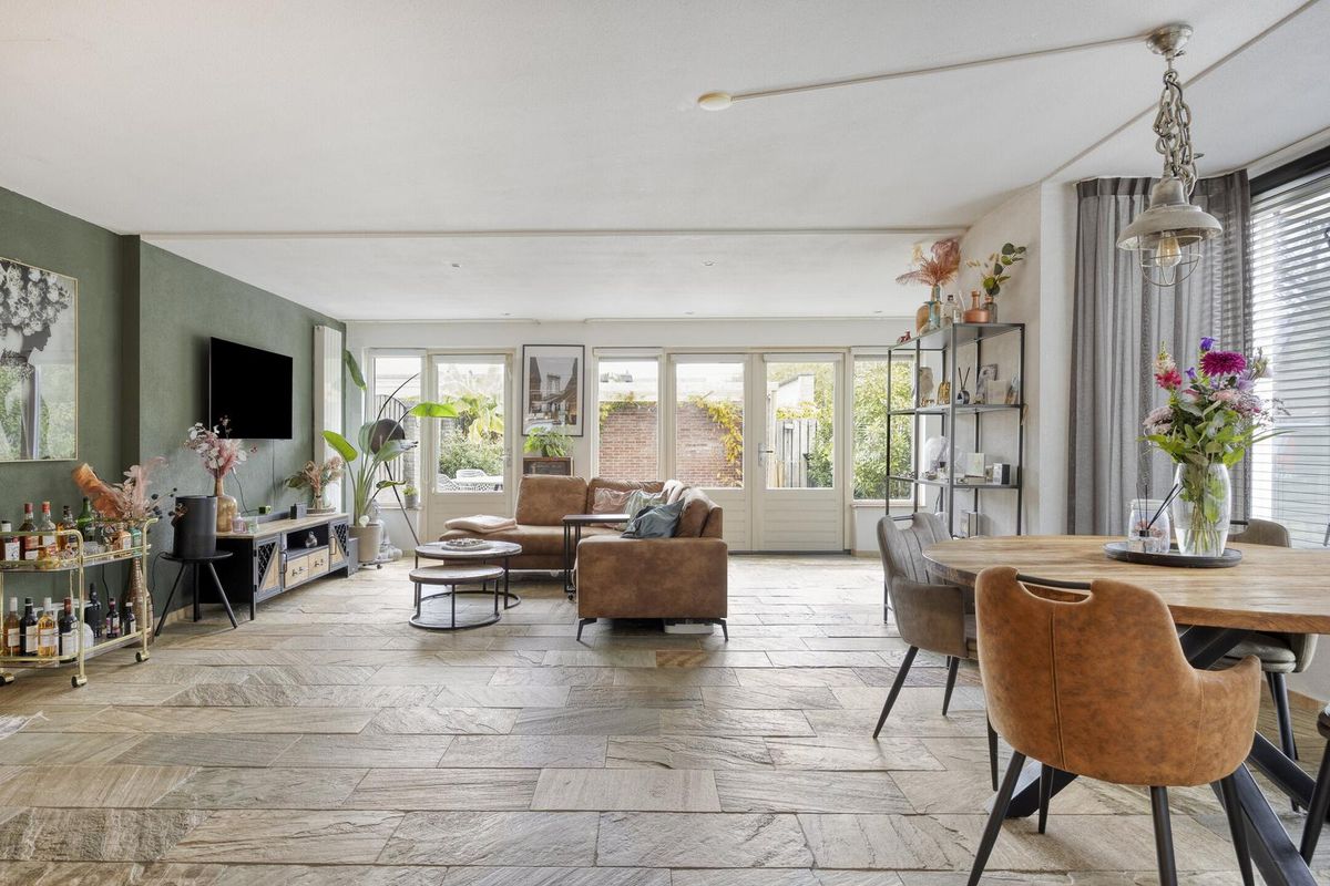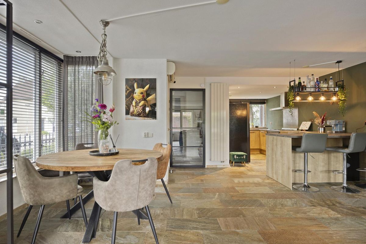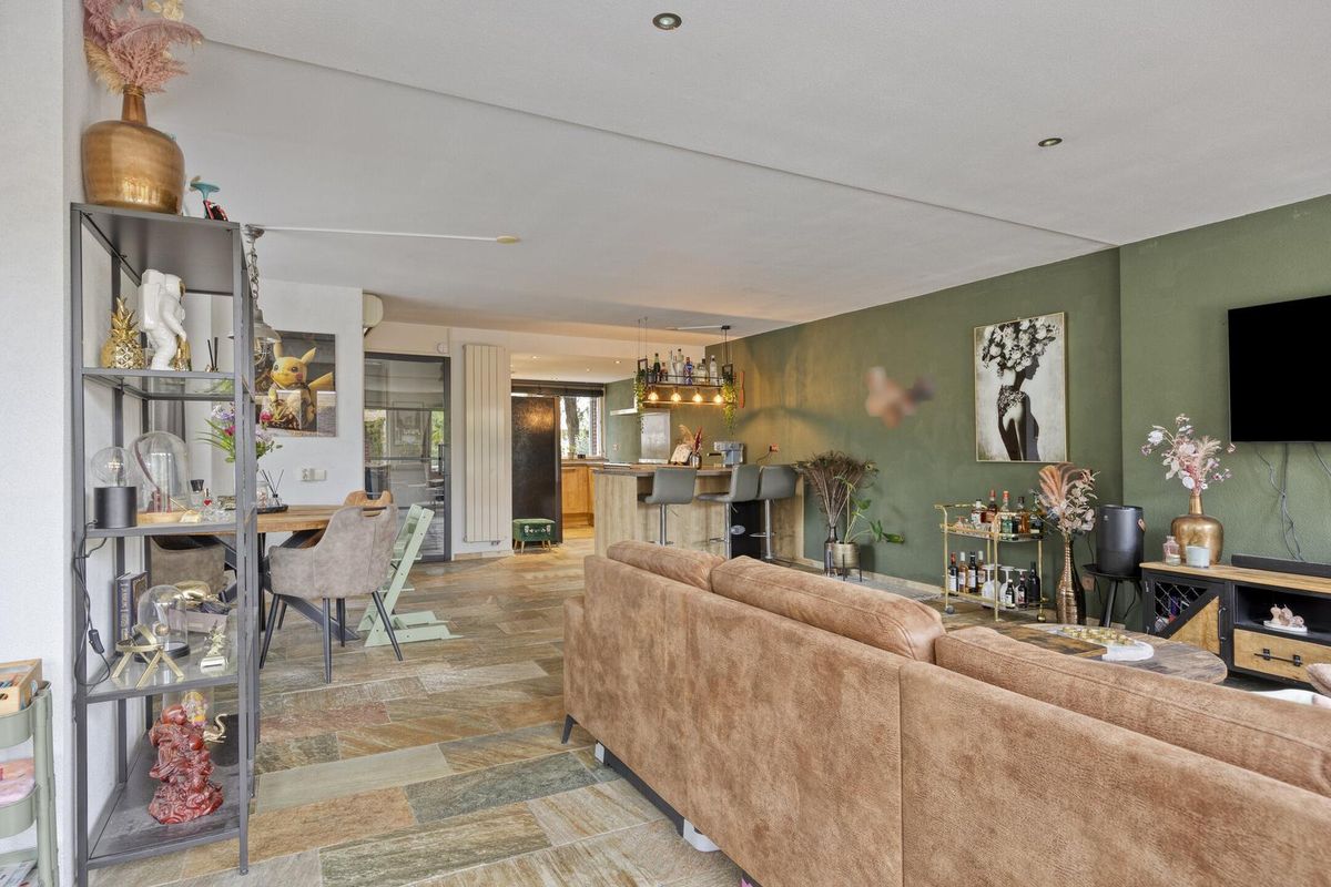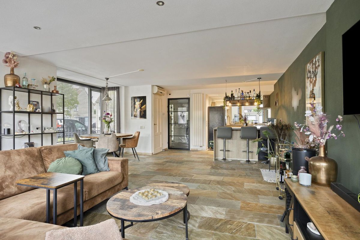 De woonkamer zelf is sfeervol en licht, met een airco voor comfort in de zomer en een vaste kast onder de trap voor extra bergruimte. De vloer is voorzien van een leisteen vloer, de wanden zijn afgewerkt met spachtelputz. Alle plafonds zijn gespoten en in de aanbouw zijn spotjes ingebouwd. Via de loopdeur of de tuindeuren loop je zo de achtertuin in, waardoor binnen en buiten fijn in elkaar overlopen.