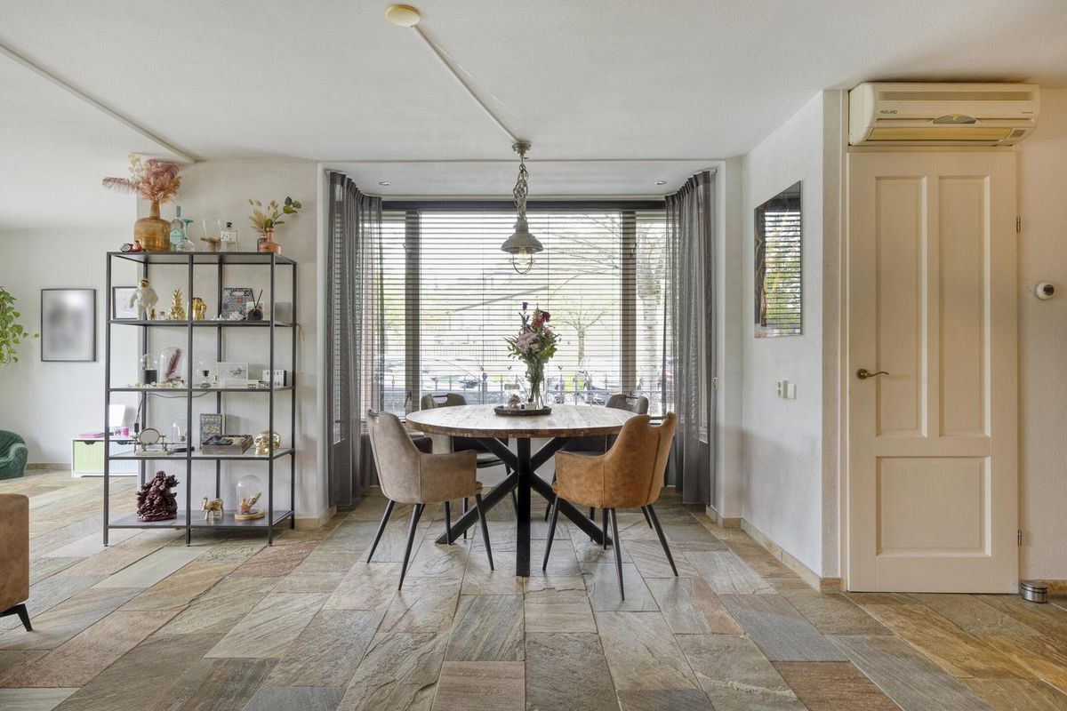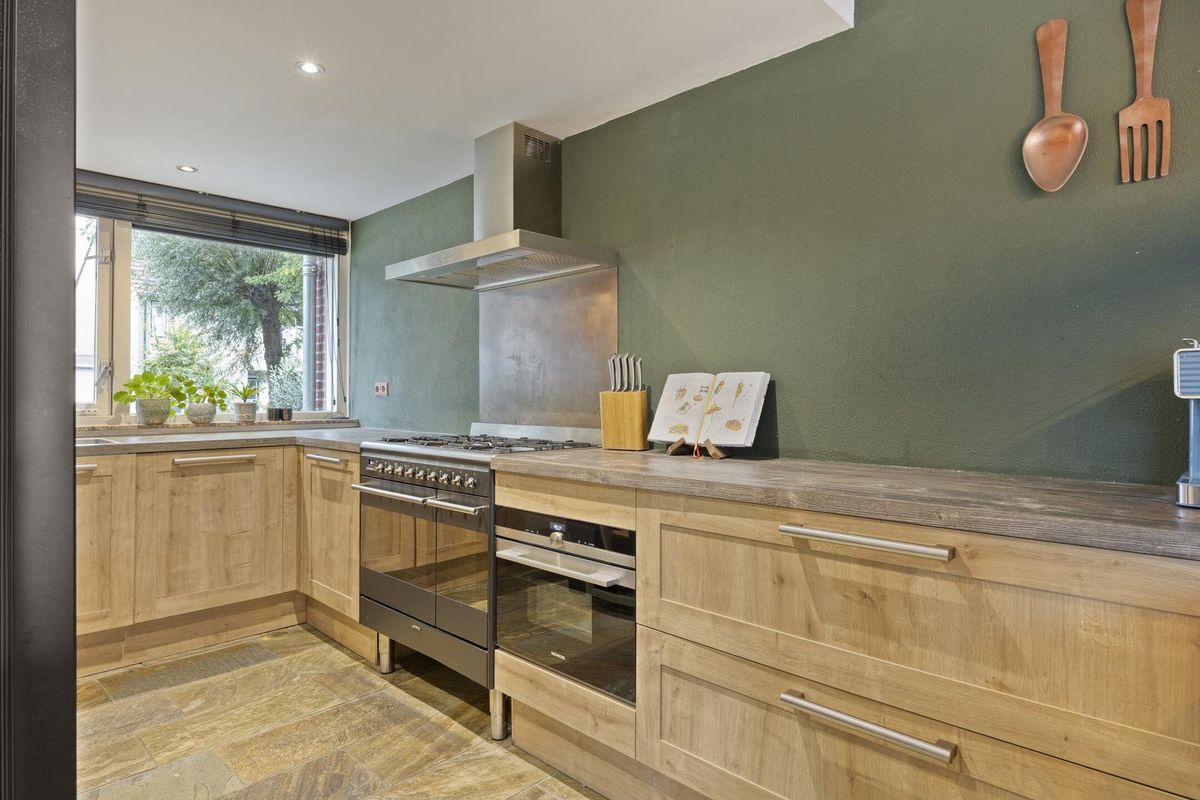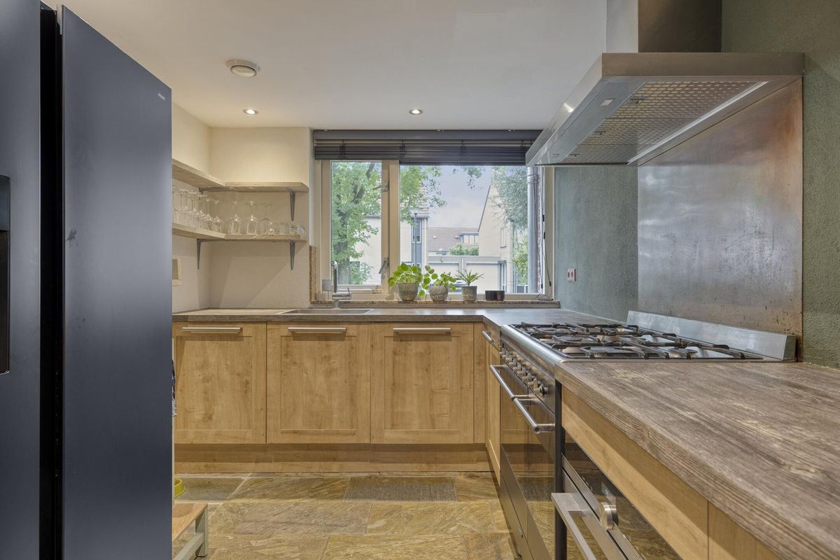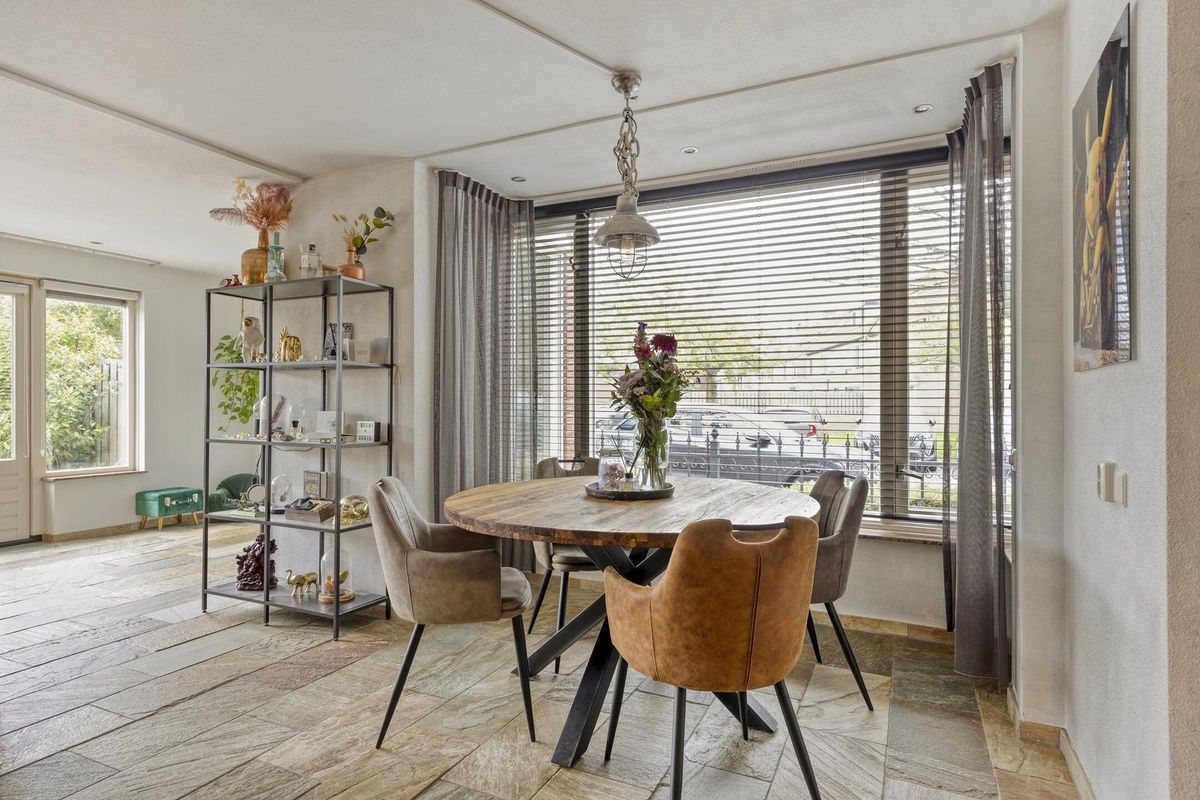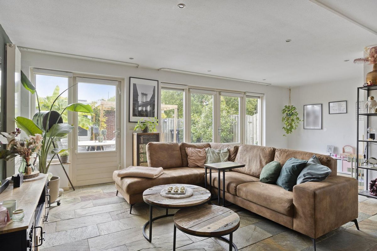 De woonkamer zelf is sfeervol en licht, met een airco voor comfort in de zomer en een vaste kast onder de trap voor extra bergruimte. De vloer is voorzien van een leisteen vloer, de wanden zijn afgewerkt met spachtelputz. Alle plafonds zijn gespoten en in de aanbouw zijn spotjes ingebouwd. Via de loopdeur of de tuindeuren loop je zo de achtertuin in, waardoor binnen en buiten fijn in elkaar overlopen.