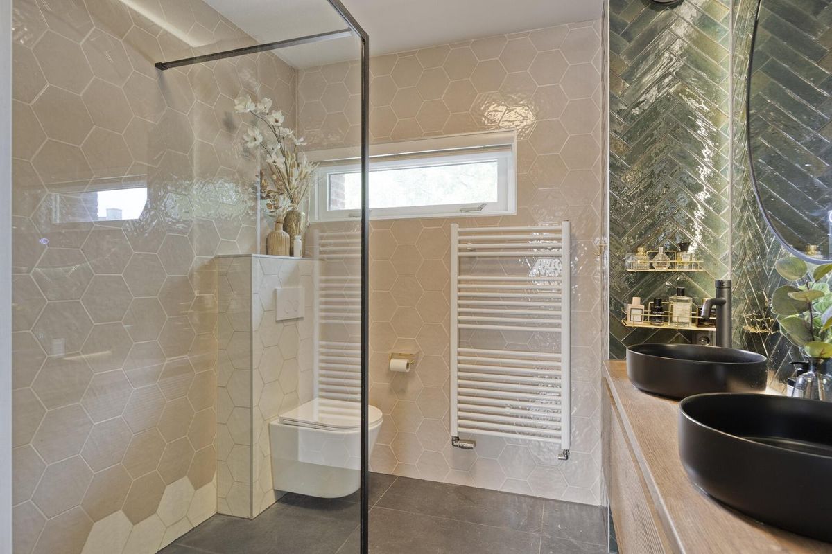 De badkamer, geplaatst in 2023, voelt aan als een echte hotelbadkamer en meet 2,21 meter breed en 2,14 meter diep. Hier begin je de dag in stijl: een dubbel wastafelmeubel met twee waskommen en kranen, een grote verlichte spiegel, een ruime inloopdouche met zowel een hand- als regendouche, een designradiator en een zwevend toilet. Alles strak afgewerkt en modern ingericht.