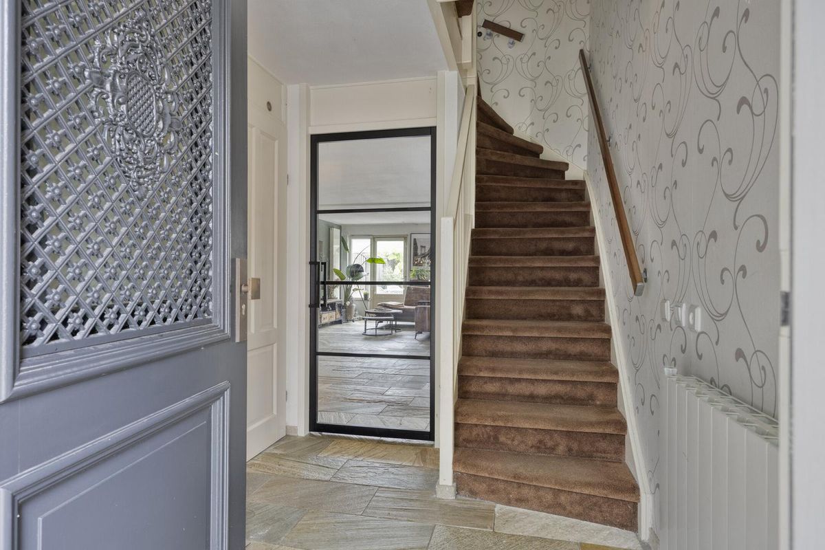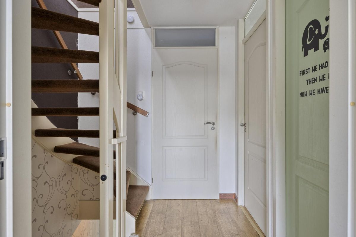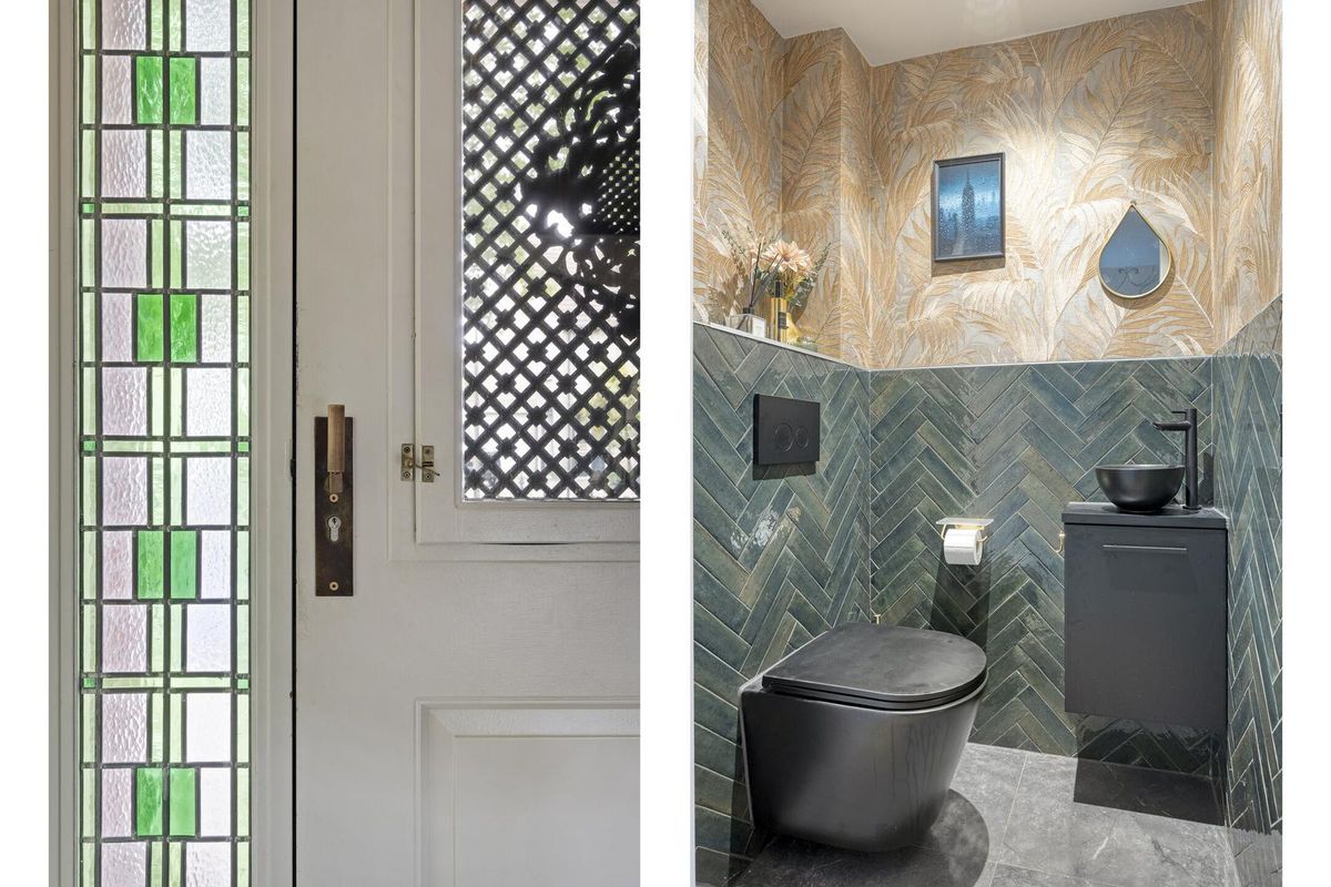 Via de voortuin kom je bij de voordeur en stap je binnen in de royale hal. Hier vind je de trapopgang, een garderobenis, de meterkast en het toilet. Het toilet is modern uitgevoerd met een zwarte closetpot, een stijlvol meubeltje met waskom en kraantje, moderne betegeling en een strak plafond met inbouwspot.