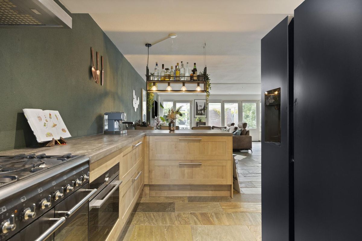 De keuken ligt aan de voorzijde en is opgesteld in een praktische U-opstelling. Hier kook je niet alleen de lekkerste gerechten, maar geniet je ook van het gemak van moderne apparatuur. Denk aan een vaatwasser, een ruime wasbak, een fornuis met zes pitten, twee ovens, een afzuigkap, grote lades, een royaal werkblad én een Amerikaanse koelkast. Dankzij de opstelling is er bovendien plek om aan de keuken aan te schuiven op barkrukken – ideaal voor een snel ontbijt, een kop koffie in de ochtendzon of terwijl de kinderen hun huiswerk maken en jij aan het koken bent.