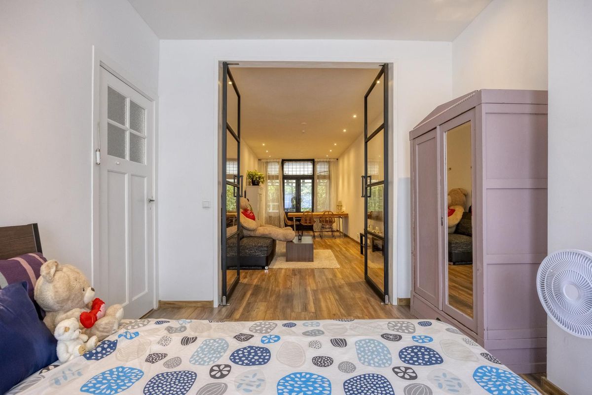 Via de (dubbele)voordeur kom je in de ruime entree van deze woning. Via de ruime hal met jaren ’30 stijl heb je toegang tot de vertrekken. De begane grond verdieping heeft alle voorzieningen voor een eventuele dubbel bewoning. Zo beschikt deze verdieping over een ruime voorkamer, middels de stalen kamer en suite deuren heb je toegang tot de ruime woonkamer met aangrenzend de openslaande deuren naar de tuin. Op deze, en de andere verdiepingen vallen direct de hoogte van de plafonds op. Vanuit de hal heb je toegang tot de moderne keuken met divers inbouwapparatuur zoals een vaatwasser, kookplaat en spoelbak. De keuken is compact en goed ingedeeld. Ideaal voor een extra bewoner op deze verdieping! Via de hal bereik je de badkamer met modern toilet, wastafelmeubel en douche. De ruimte is netjes betegeld en heeft net zoals de rest van deze verdieping een moderne uitstraling.