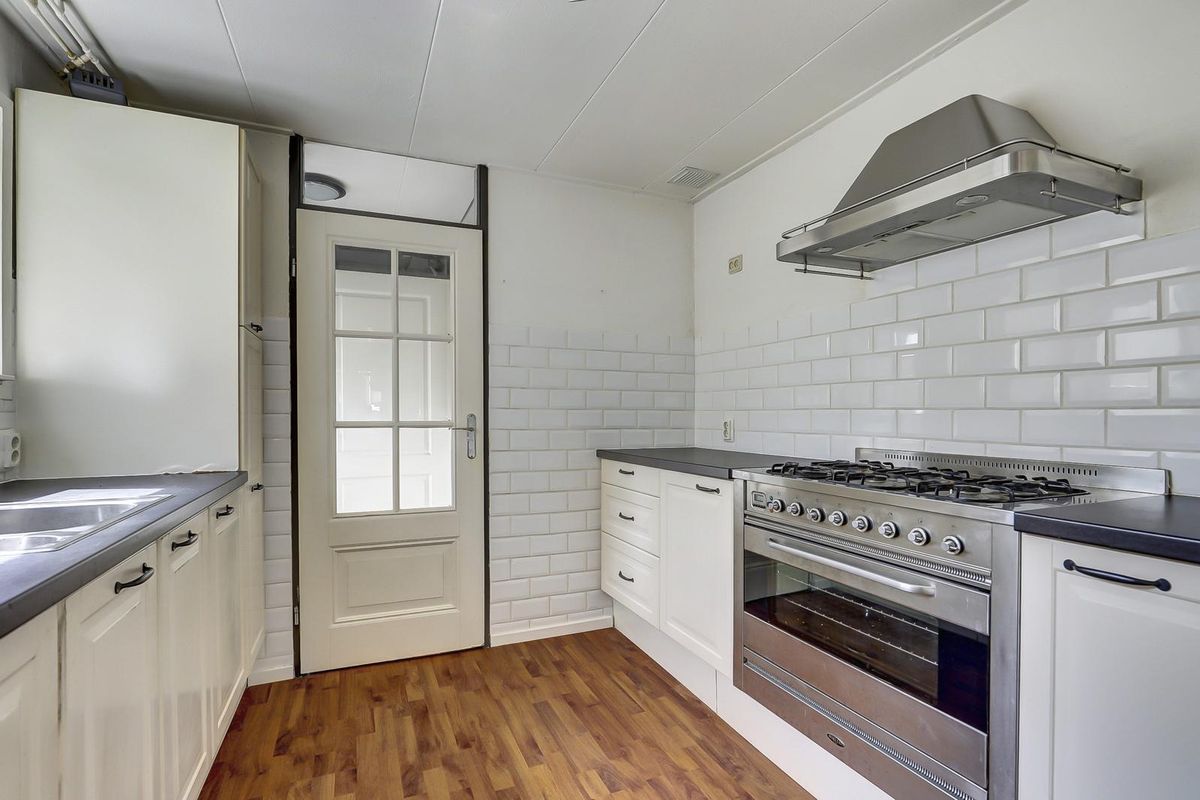 Gesloten keuken met aan beide zijden een keukenblok, veel kastruimte en inbouwapparatuur: vaatwasser, koel-/vriescombinatie, 6-pits gaskookplaat met oven, rvs-afzuigkap en vergrote spoelbak. Vanuit de keuken toegang tot de hal die leidt naar het toilet en de bijkeuken.