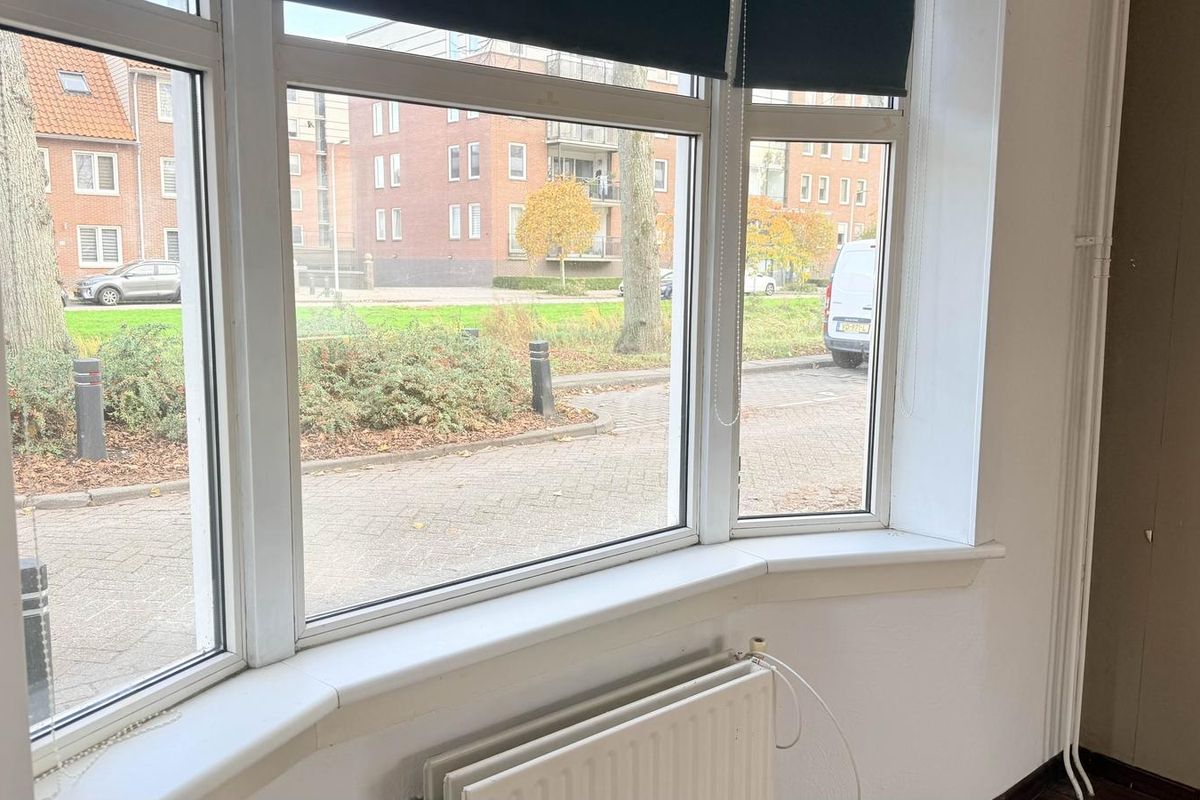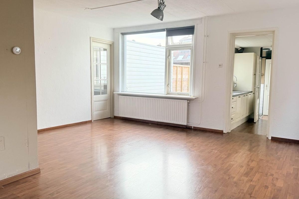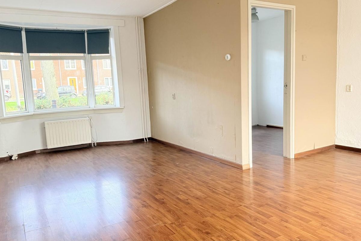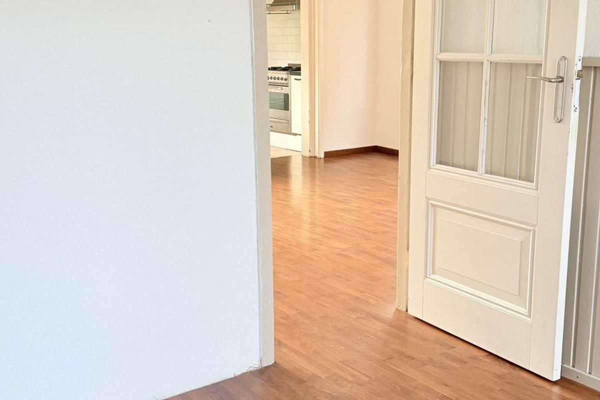 L-vormige woonkamer met veel licht door de erker aan de voorzijde en extra zijraam. Vanuit de woonkamer toegang tot de gesloten keuken. De vloer is voorzien van laminaat, het plafond is afgewerkt met gipsplaten. Via een aparte hal is de trapopgang naar de eerste verdieping bereikbaar.