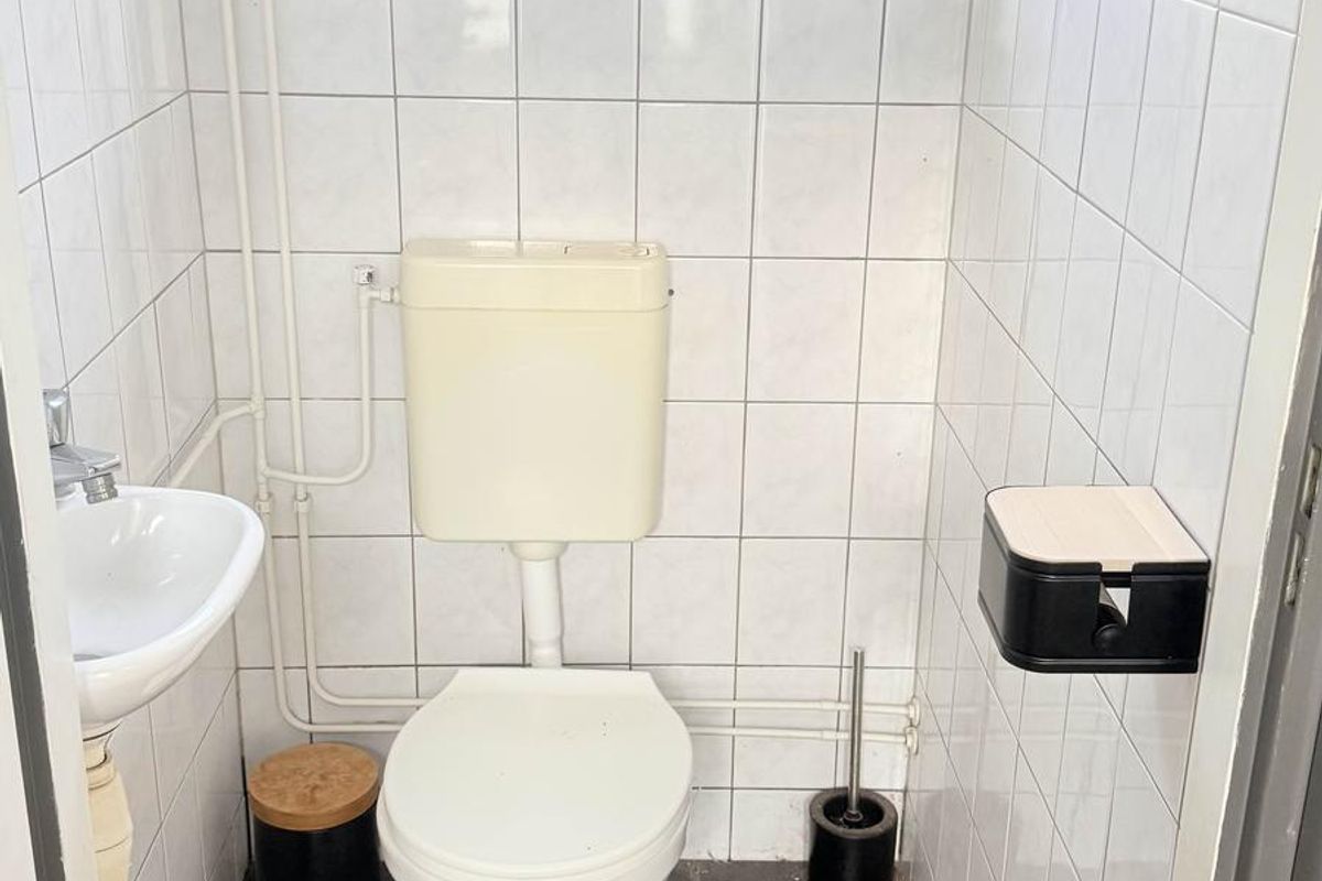 Gedeeltelijk betegelde toiletruimte in grijs met witte kleurstelling voorzien van een toilet en een fontein.