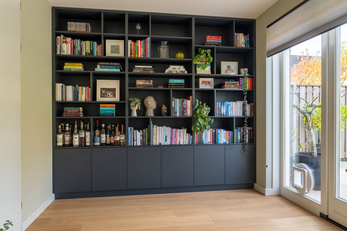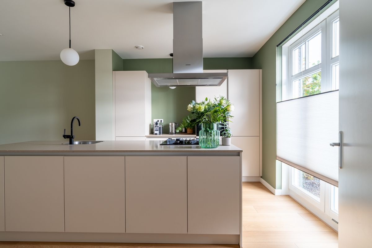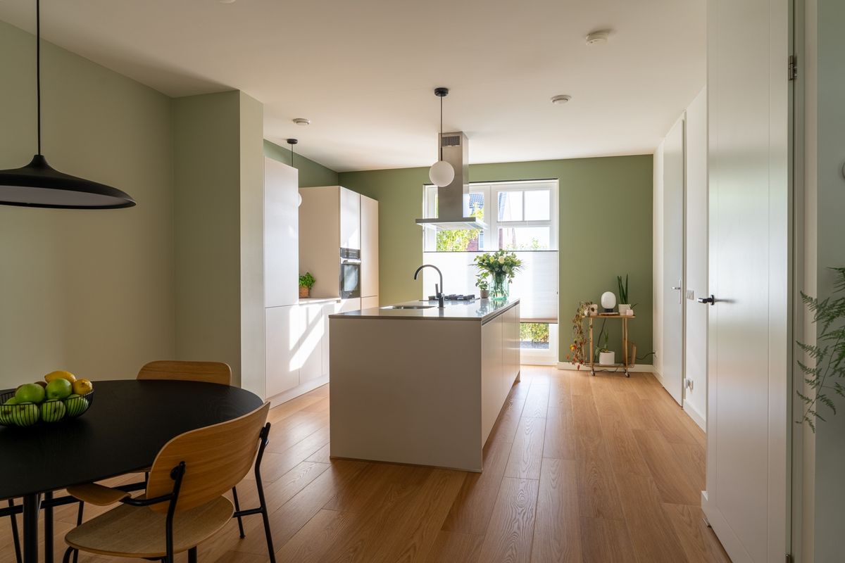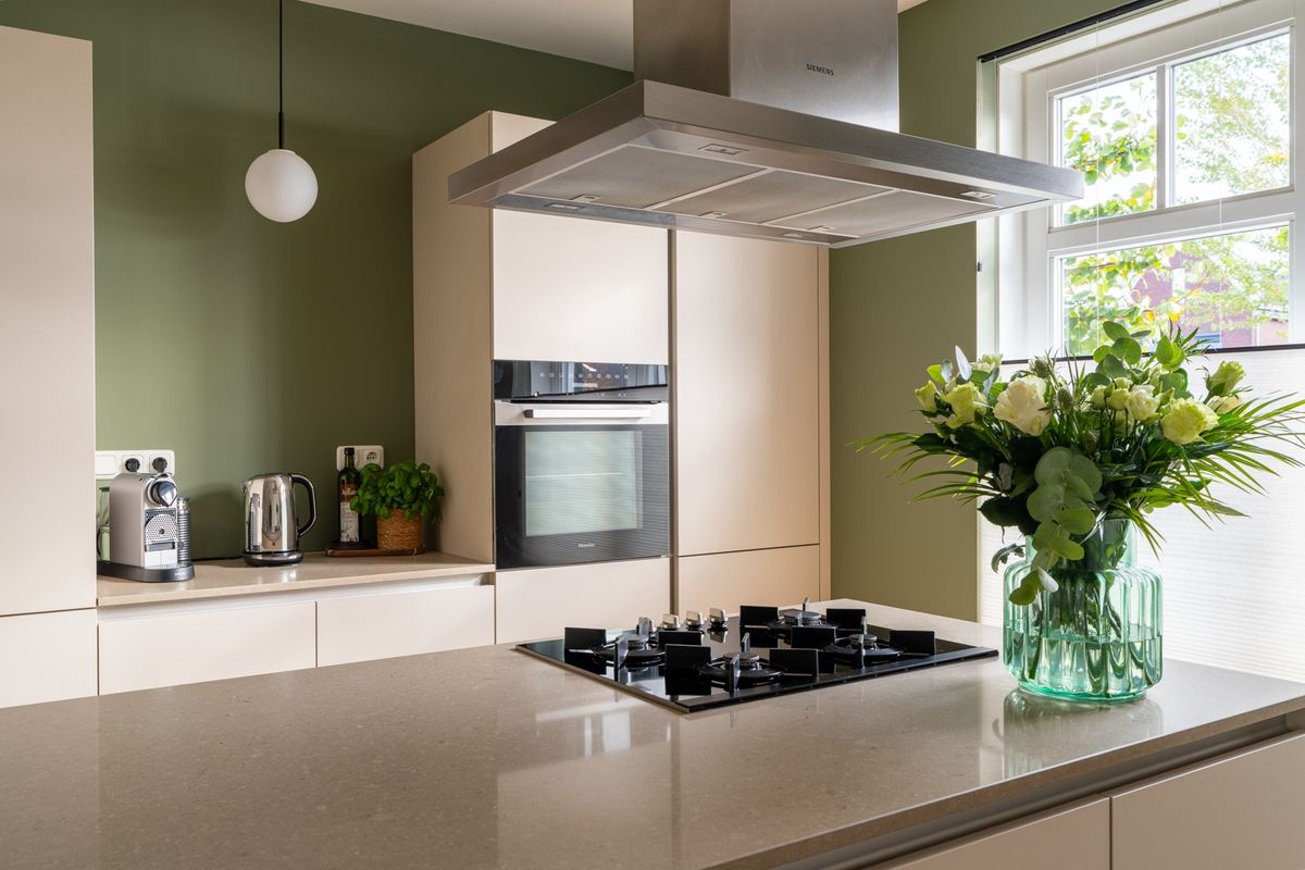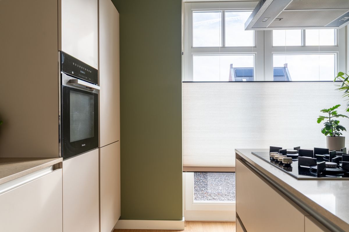 De woonkamer is verrassend ruim dankzij de uitbouw en ademt sfeer en licht door de hoge ramen. Vanuit de keuken kijk je heerlijk vrij uit over een vijverpartij — een rustgevend uitzicht dat elke dag een glimlach oplevert. De moderne eilandkeuken is een echte eyecatcher: uitgevoerd in een warme, eigentijdse stijl met beige fronten en natuurstenen blad. De keuken is compleet uitgerust met een koel-vriescombinatie, oven, gaskookplaat, afzuigkap en vaatwasser.