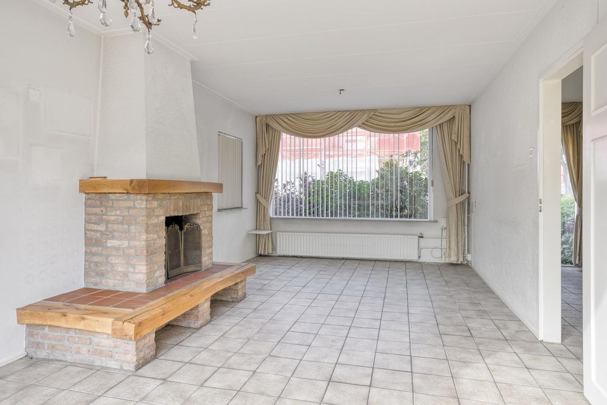 De woonkamer is afgewerkt met een tegelvloer, deels stucwerk en deels spachtelputz als wandafwerking en een gipsplaten plafond. De woonkamer is voorzien van een inbouwkast en een schouw met open haard. Het raam aan de voorzijde beschikt over een zonnescherm en het raam aan de achterzijde beschikt over een zonnescherm en een rolluik. Vanuit de woonkamer is de keuken bereikbaar. Middels de achterdeur is de achtertuin bereikbaar.