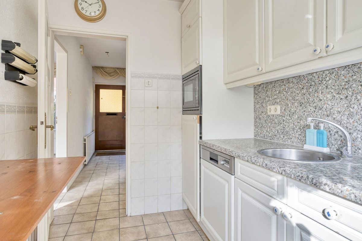 De keuken is afgewerkt met een tegelvloer, deels tegels, deels spachtelputz als wandafwerking en een gipsplaten plafond. De keuken in rechte opstelling is voorzien van een kunststof aanrechtblad, 4-pits gasfornuis, combimagnetron, vaatwasser, afzuigkap en een enkele spoelbak. De keuken beschikt tevens over een inbouwkast en middels de achterdeur is de achtertuin bereikbaar.