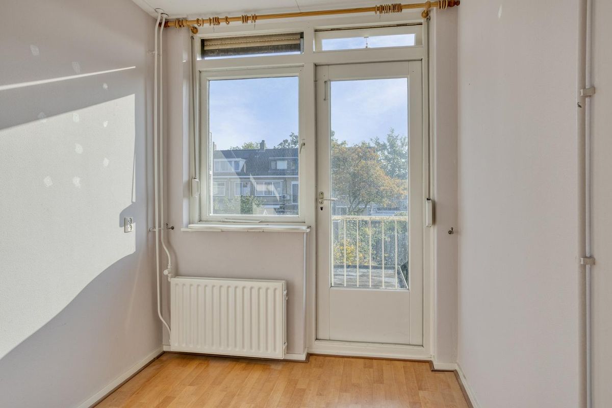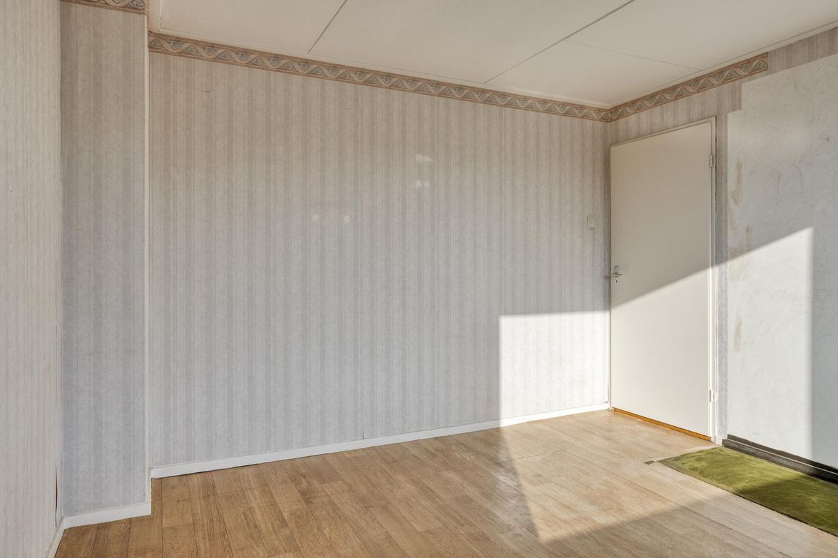 De kleine slaapkamer aan de achterzijde is afgewerkt met een laminaatvloer, stucwerk als wandafwerking en een zachtboard plafond. In de slaapkamer bevindt zich de wasmachine aansluiting en middels de deur is het balkon toegankelijk.