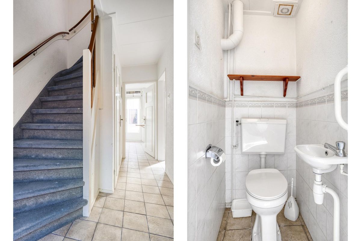 Het toilet is afgewerkt met een laminaatvloer en stucwerk als wand- en plafondafwerking. Het toilet is voorzien van een hangend closet.