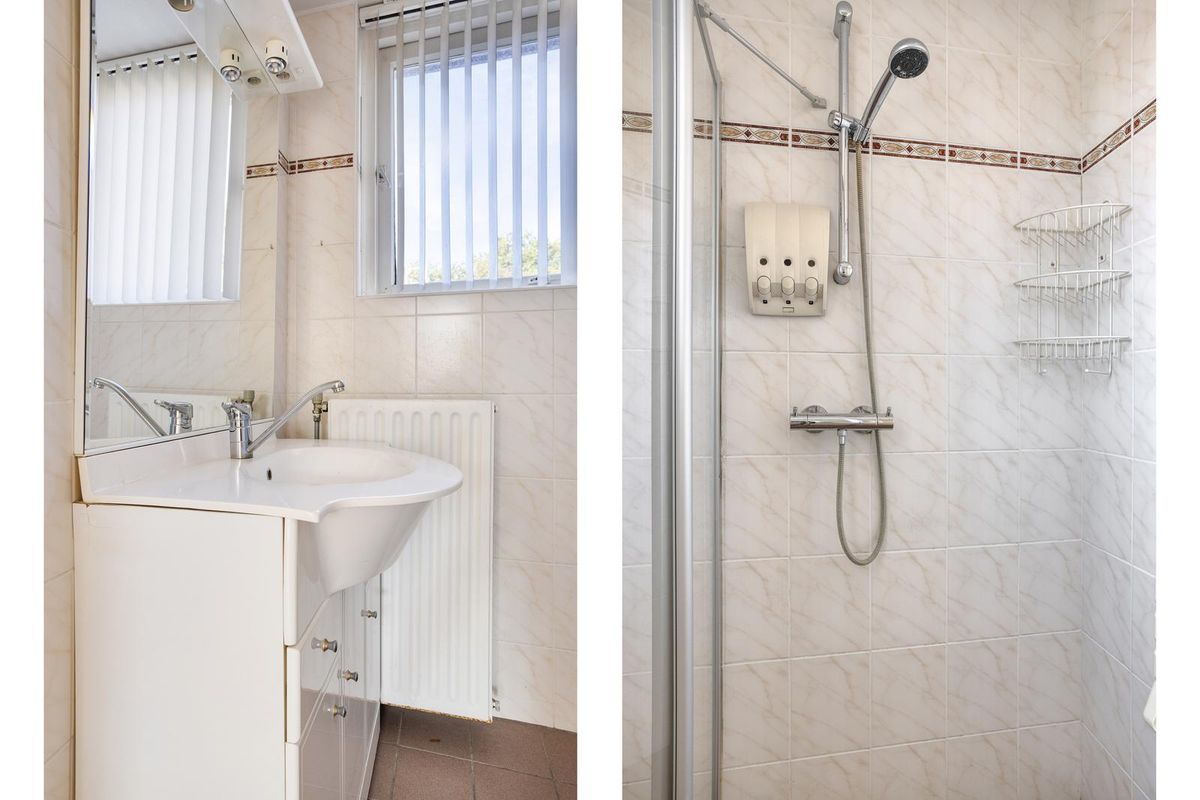 De badkamer is afgewerkt met tegels als vloer- en wandafwerking en een gipsplaten plafond afgewerkt met structuurverf. De badkamer is voorzien van een douchecabine en een wastafel.