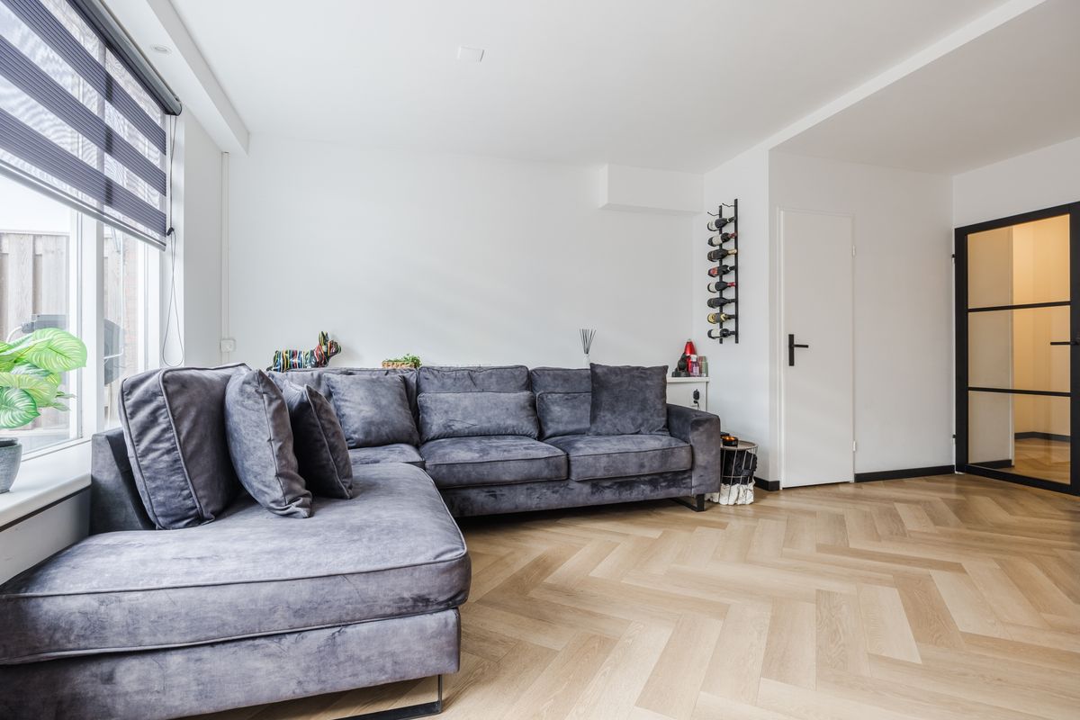 De ruime woonkamer (ca. 25 m2) is ingedeeld in een woon- en eetgedeelte. Door de grote ramen heeft de woning veel lichtinval. De woonkamer is voorzien van een visgraat laminaat vloer en is geheel gestuct. Via de woonkamer heeft u toegang tot de achtertuin (ca. 58 m2). De achtertuin is gelegen op het zuidoosten en is ook bereikbaar via een achterom.