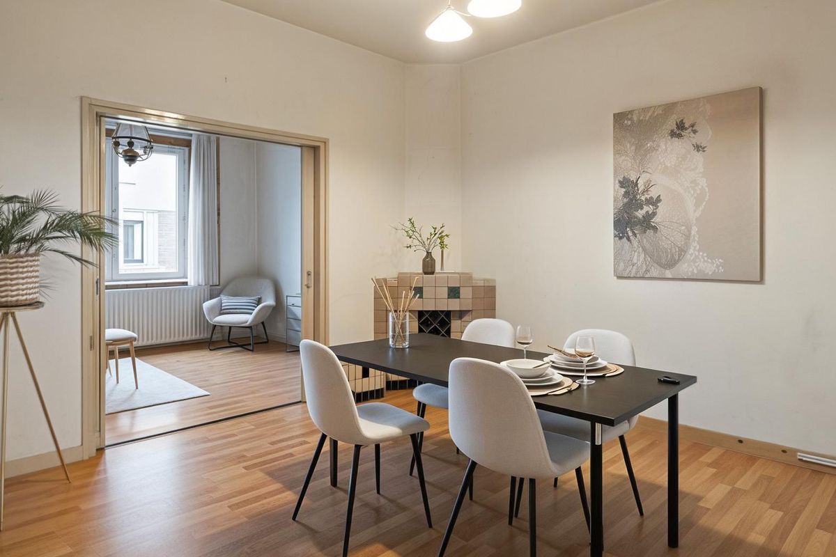 De eetkamer is voorzien van een laminaatvloer en heeft via een schuifdeur verbinding met de woonkamer – perfect om de ruimtes open of juist knus te houden.