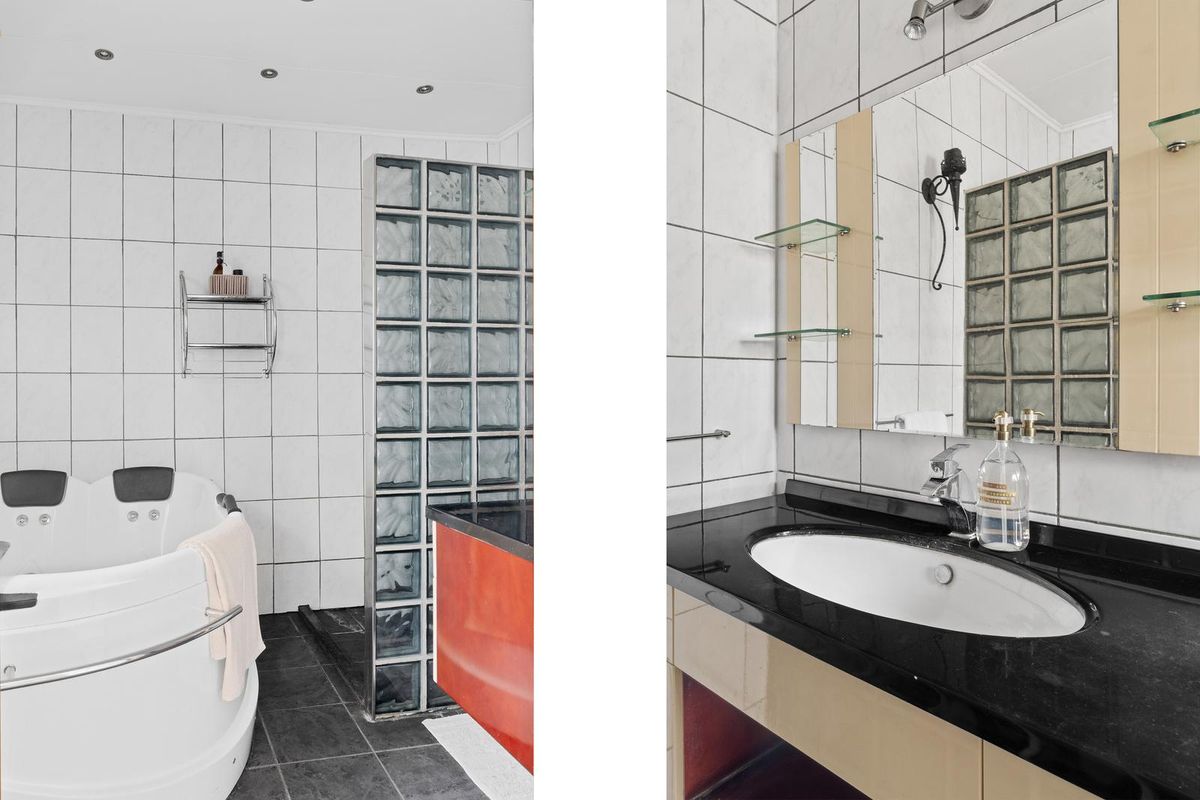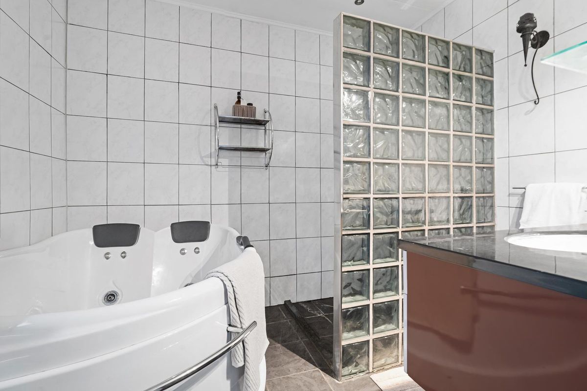 De badkamer is volledig betegeld en voorzien van een inloopdouche, een ligbad, een wastafel met meubel en spotverlichting.