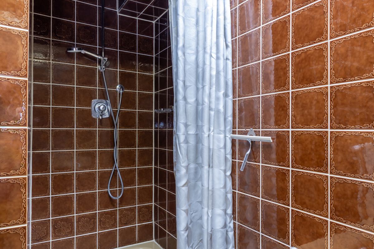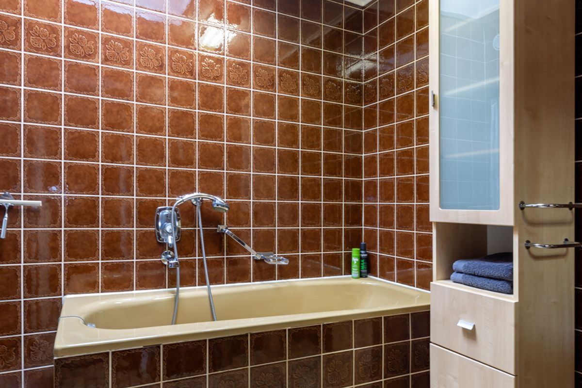 Deels betegelde badkamer (2.22*2.02m) met douche, vaste wastafel en aansluitpunt voor witgoedapparatuur.