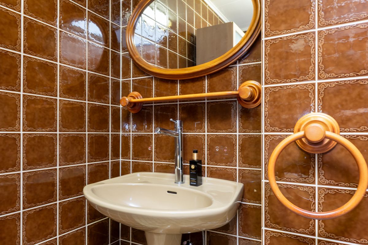 Tweede entree, hal met natuurstenen vloer, een halfhoog betegelde toiletruimte met staand closet en fonteintje, slaapkamer 3) (circa 10m2), volledig betegelde badkamer met ligbad, douche, vaste wastafel en lichtkoepel.
