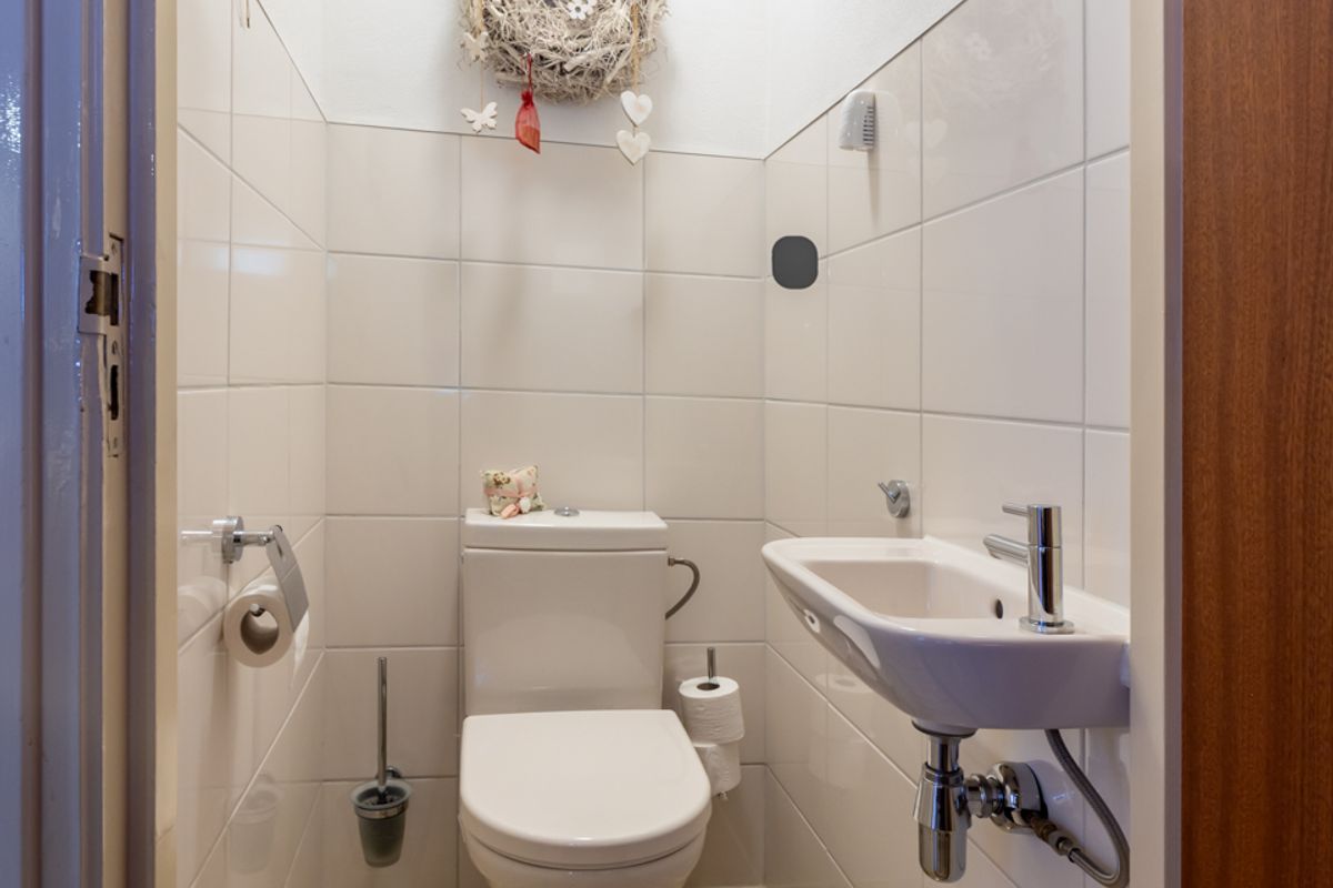 Overdekte entree, hal met natuurstenen vloer, meterkast, garderobe, een halfhoog betegelde toiletruimte met staand closet en fonteintje en Slaapkamer 1) (circa 9,5m2)