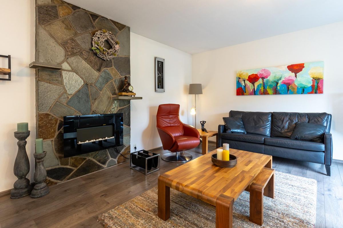 Woonkamer (circa 25m2) met deur naar betegelde oprit/terras en lichtkoepel.