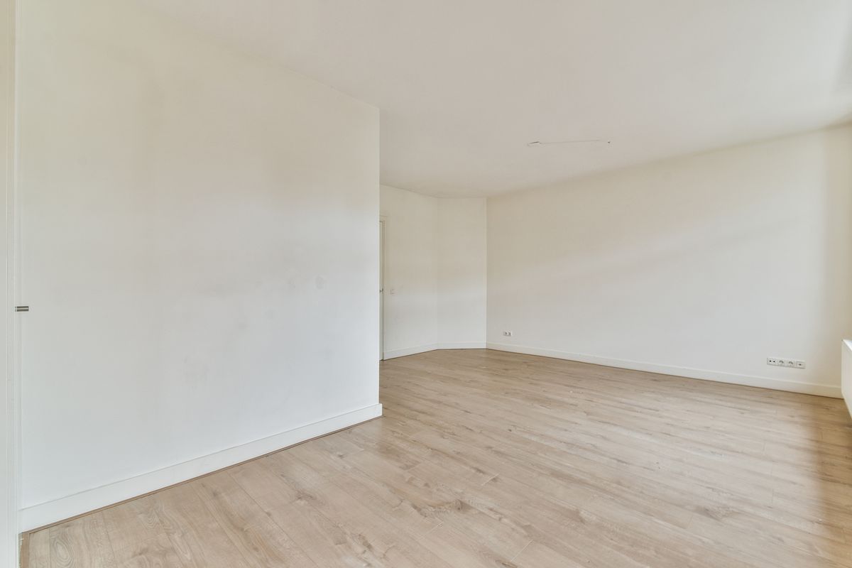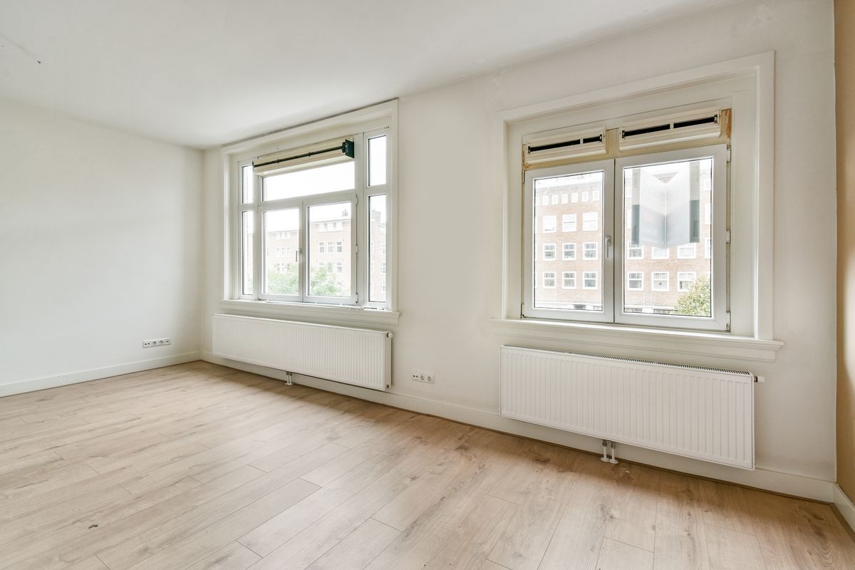 Aan de straatzijde ligt de lichte woonkamer met twee grote ramen die uitkijken over de bruisende Bos en Lommerweg.