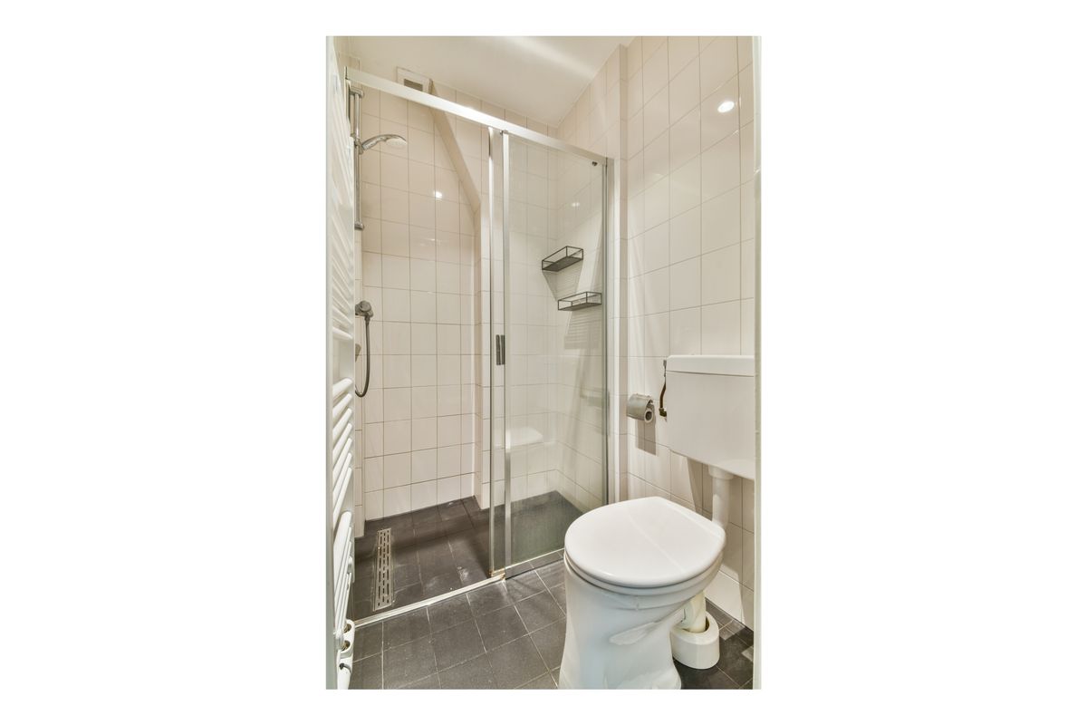 Uitgerust met een douchecabine met glazen wand, handdoekradiator en toilet.