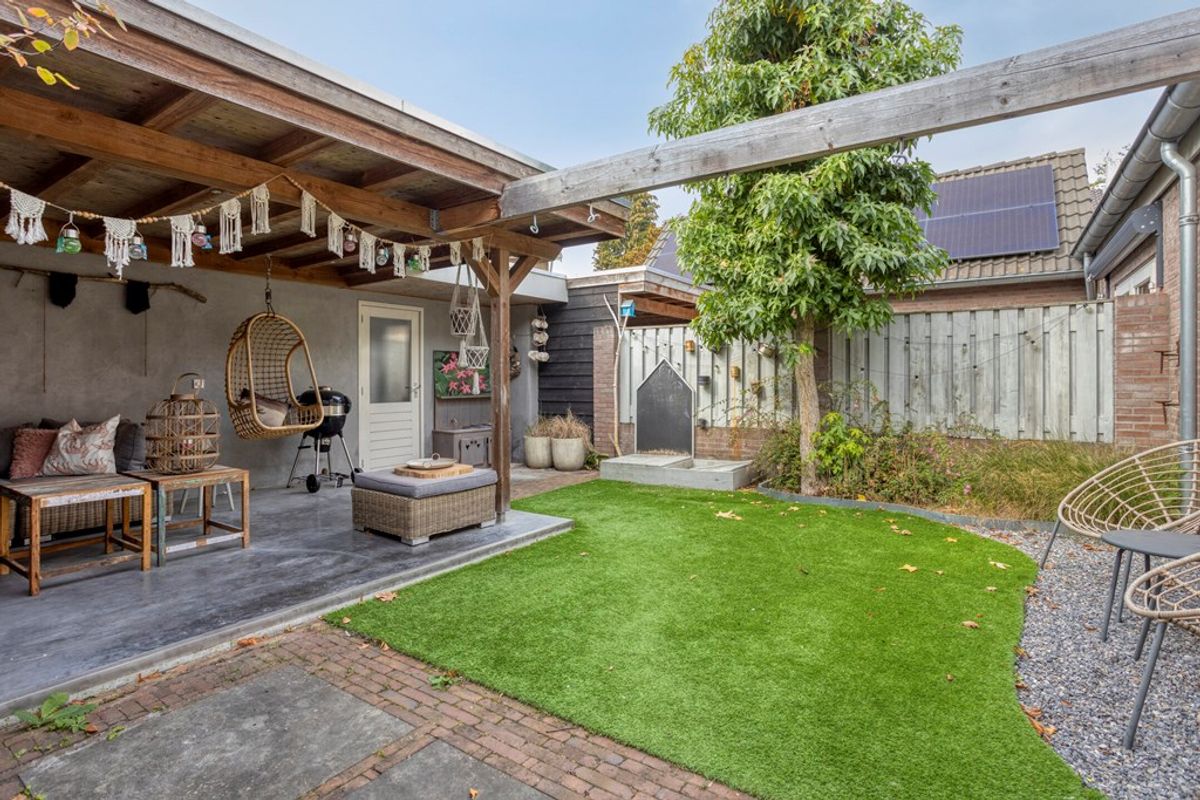 De zonnige achtertuin op het zuidwesten is onderhoudsvriendelijk aangelegd met bestrating, borders en kunstgras. Aan de ruime berging van ca. 20 m² grenst een sfeervolle houten overkapping, waar u heerlijk beschut kunt zitten. Dankzij de gunstige ligging geniet u hier tot in de avonduren van de zon.