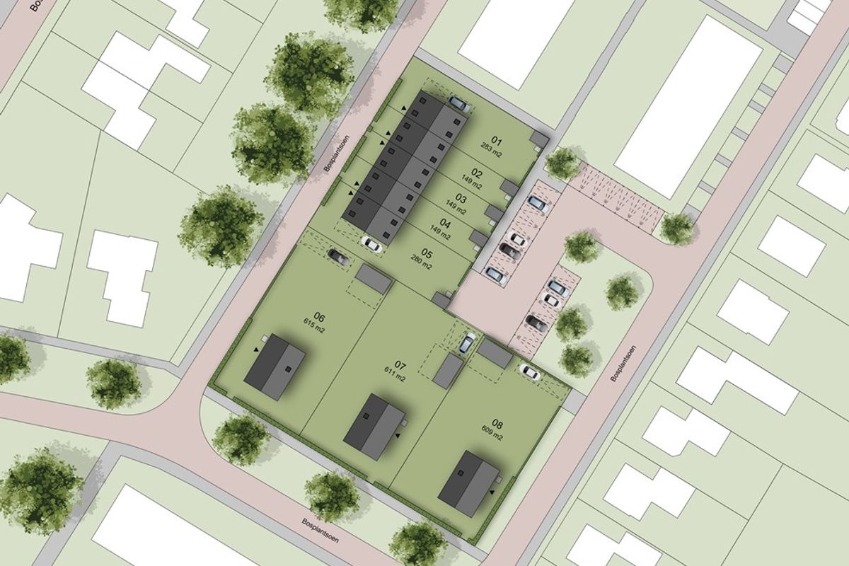 In het centrum van het dorp Zevenhuizen, aan de straat Bosplantsoen, worden acht nieuwbouwwoningen gerealiseerd. Het nieuwbouwplan bestaat uit vijf rijwoningen en drie vrijstaande woningen. Alle woningen kijken uit op een brede groenstrook met riante bomen.
