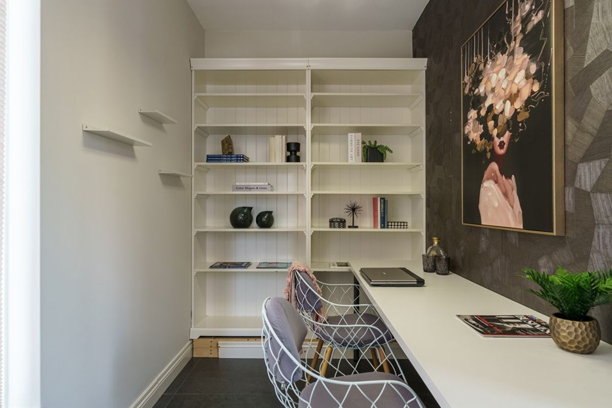 Naast de woonkamer vind je de werkkamer, ideaal voor thuiswerken of studeren. Het daglicht stroomt hier binnen door de grote ramen aan de voorkant en zijkant. Werk in alle rust en comfort in deze inspirerende ruimte.