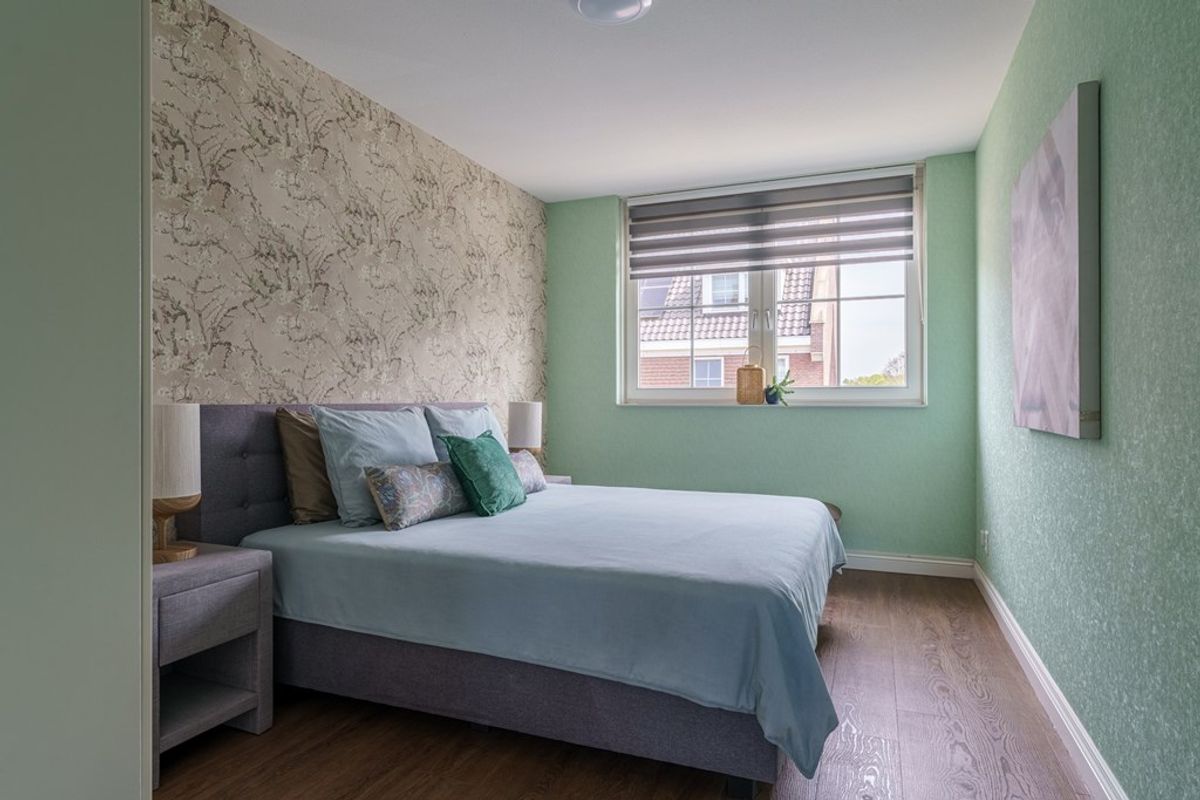 Slaapkamer 1 en 2 bevinden zich aan de voorzijde van de woning. Geniet van de comfortabele pvc-vloer met vloerverwarming, sfeervolle behangen wanden en een strak spuitwerk plafond.