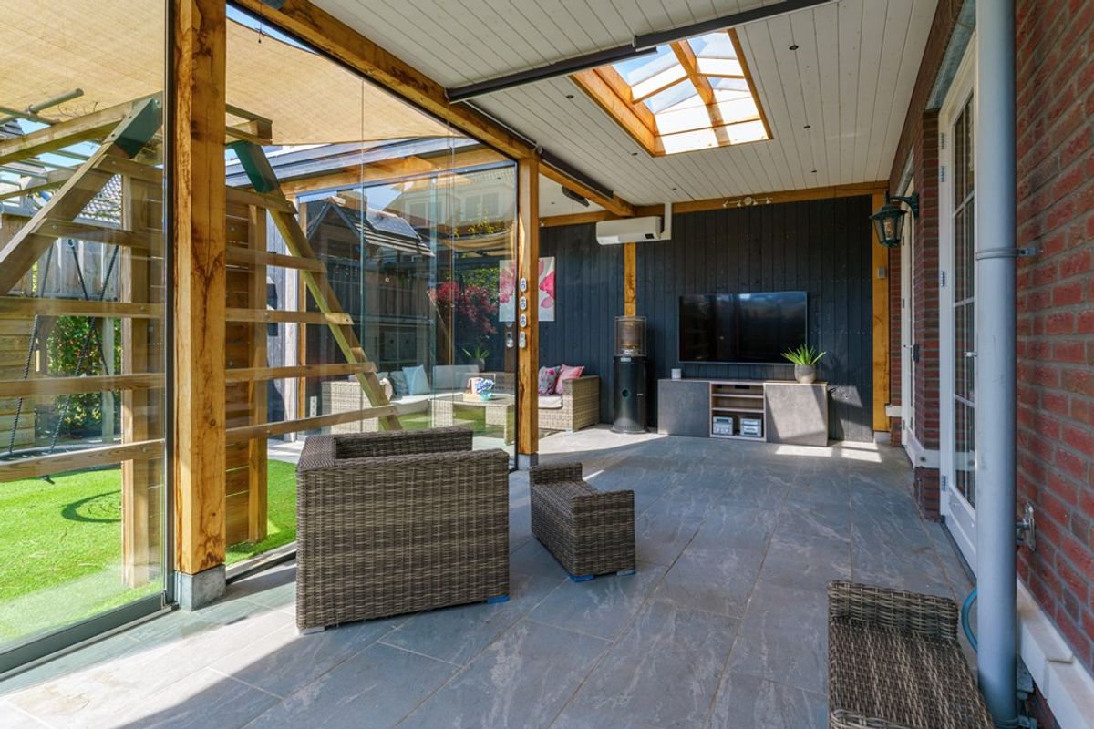 Een mooi terras/serre met tegelvloer, houten schroten wanden en plafond met inbouwspots en een lichtstraat om het zachte zonlicht naar binnen te laten stralen. Gooi die glazen schuifdeuren open en laat de frisse lucht binnenkomen, terwijl je geniet van het uitzicht op je tuin. Het is af te sluiten, dus zelfs als het weer niet meezit, hoef je niet naar binnen te vluchten. Er zijn stopcontacten, tv en audio aansluiting, en geen zorgen over de temperatuur, want er is een heater én airco. En ja, er is zelfs een handige houten berging daar te vinden!