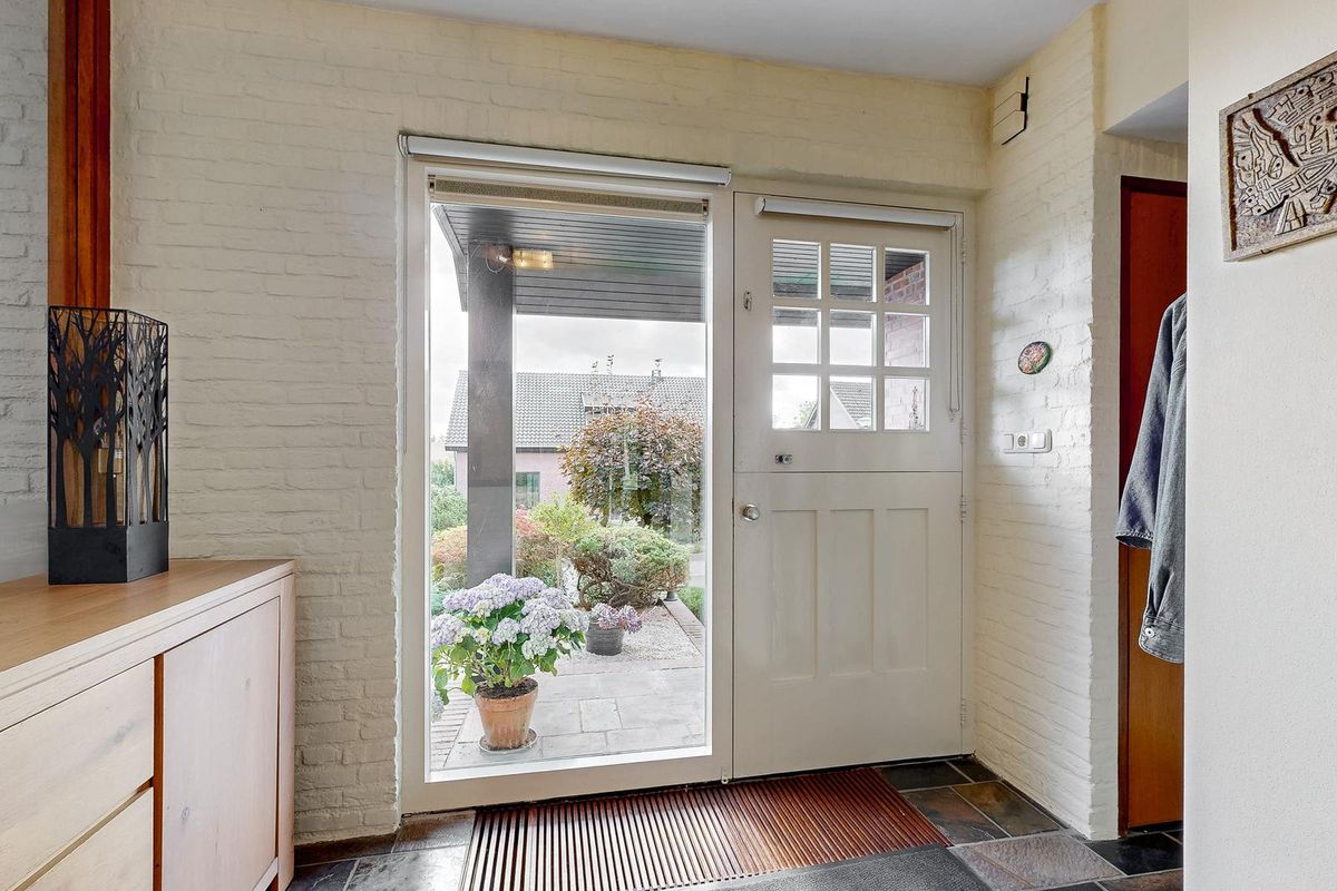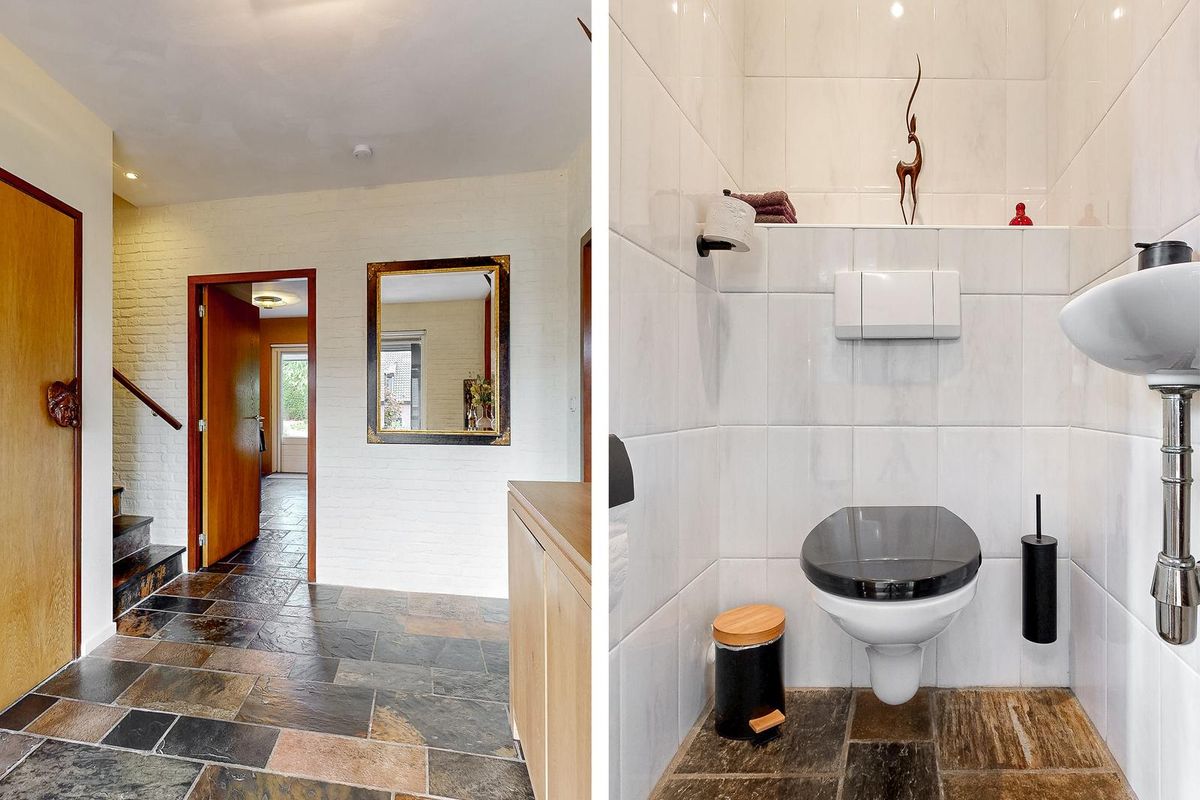 Via een overdekte entree is toegang tot de ontvangsthal (10,2 m2). Aan de linkerzijde bevindt zich de meterkast met aansluitingen van de drie nutsvoorzieningen (reeds voorbereid op drie fasen) die wordt geflankeerd door een garderobenis. Naast de garderobe bevindt zich het betegelde gastentoilet met vrijhangend sanitair en fonteintje. De vloer van de hal is afgewerkt met de Indiase leisteen ‘Peacock’ en loopt drempelloos door in zowel het toilet als de living. In de wand naar de living is een brede raampartij opgenomen die zowel de hal als woonkamer een transparant karakter verleent. Vanuit de woonkamer is er middels een schuifpui de toegang tot het overdekte terras en de mooie achtertuin.