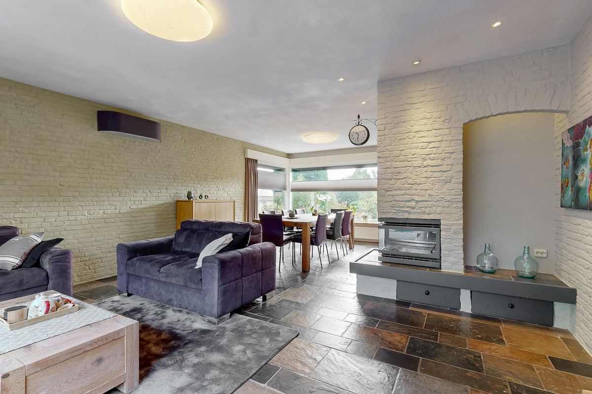 De woonkamer heeft een L-vormig grondplan (38,2 m2) en met een breed hoekraam uitzicht op de voor- en zijtuin en de lagergelegen straat ‘Bosveld’. In het plafond zijn zeven ingebouwde halogeenspots opgenomen en de openhaardpartij is voorzien van een inzetgashaard van Barbas. Aan de achterzijde biedt een schuifpui toegang tot het overdekte terras en aan de linkerachterzijde staat de woonkamer in verbinding met de halfopen keuken.