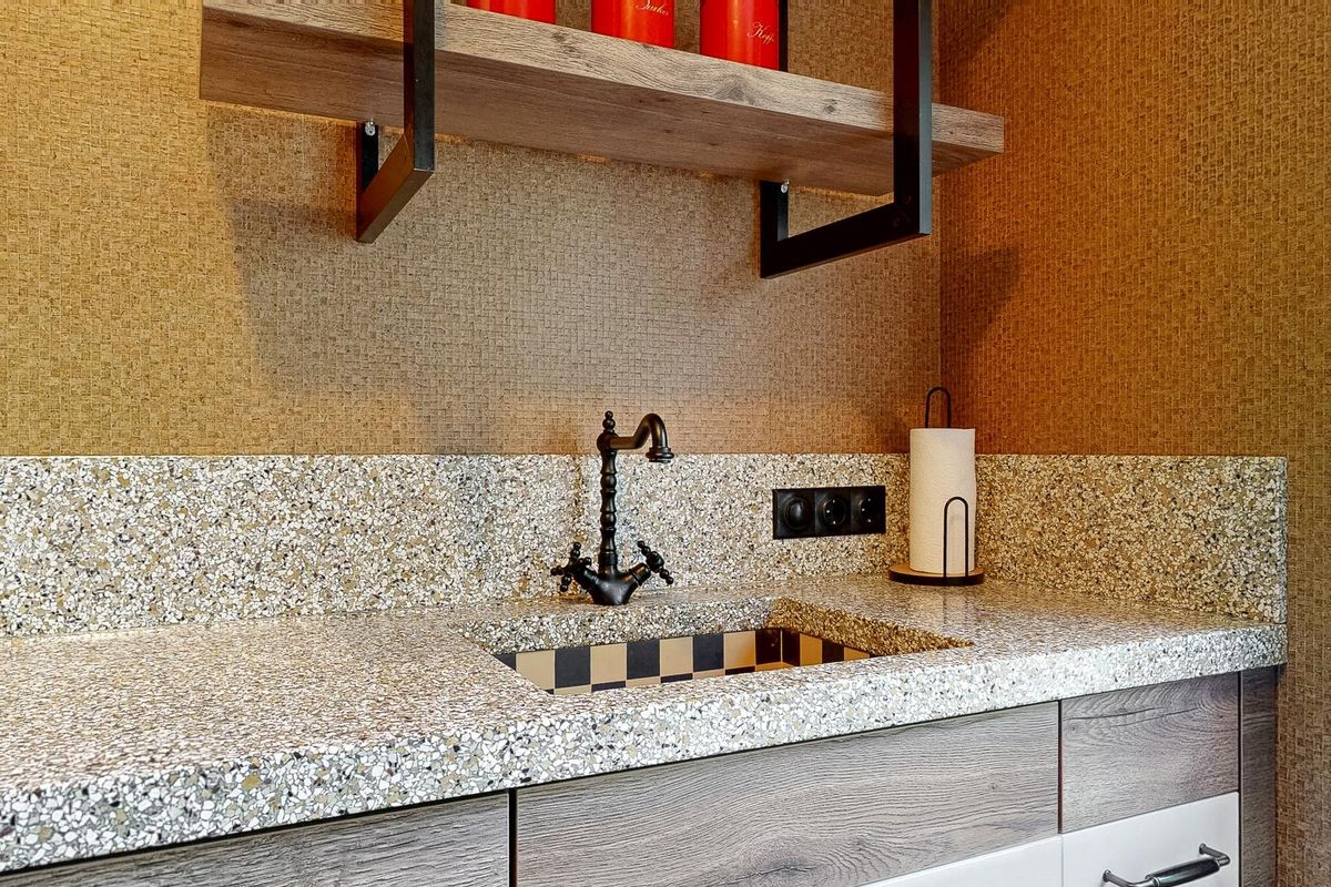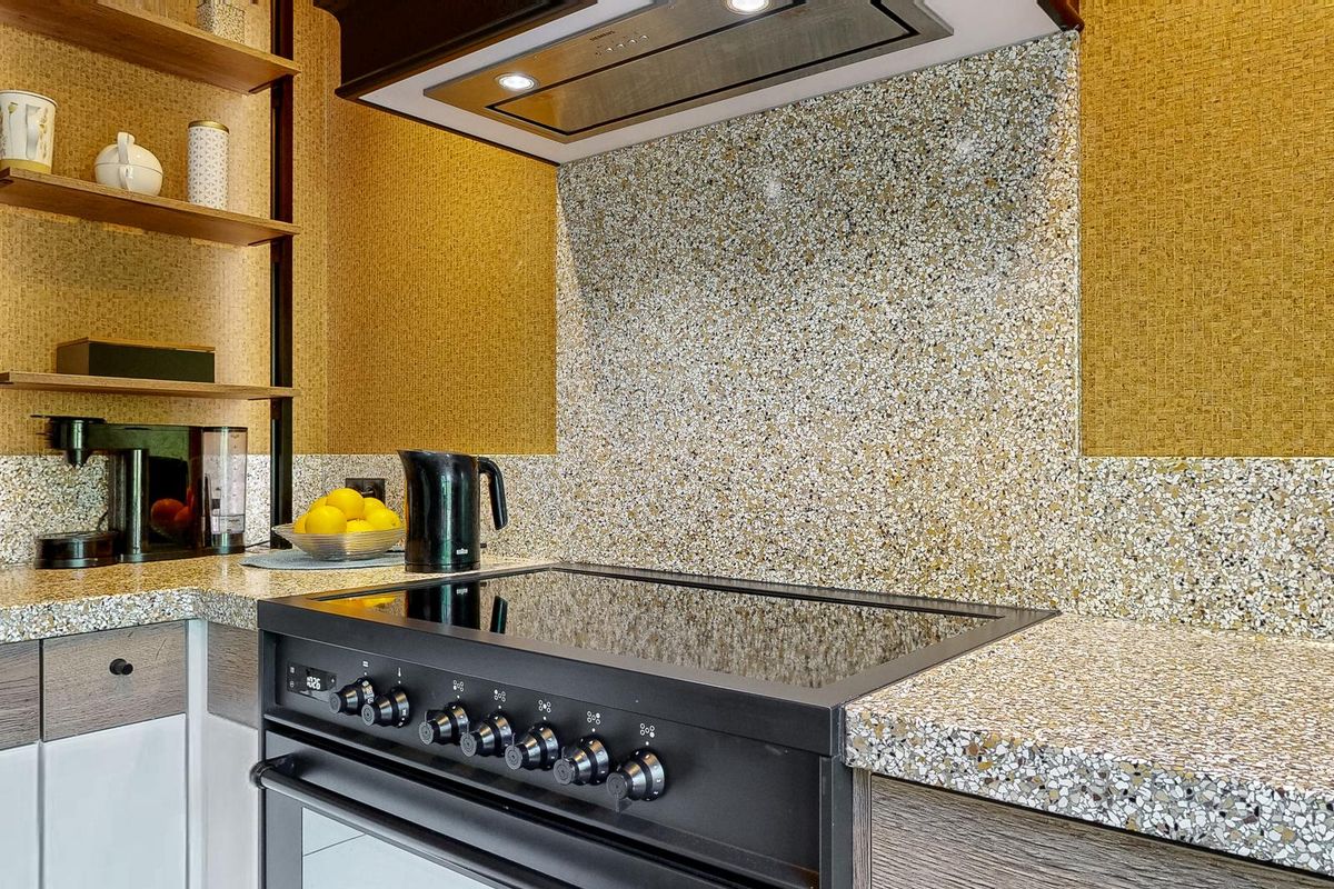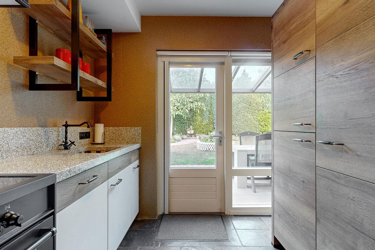 De halfopen keuken (9,9 m2) heeft een inrichting in L-opstelling met een nieuwe luxe aanbouwkeuken (vernieuwd in 2023) voorzien van boven- en onderkasten en een werkblad van granito- terrazzo en met een spoelbak waarin met mengkraan is opgenomen. Tot de inbouwapparatuur behoren een 5-pits inductiekookplaat, een oven, een koelkast en een afwasmachine.