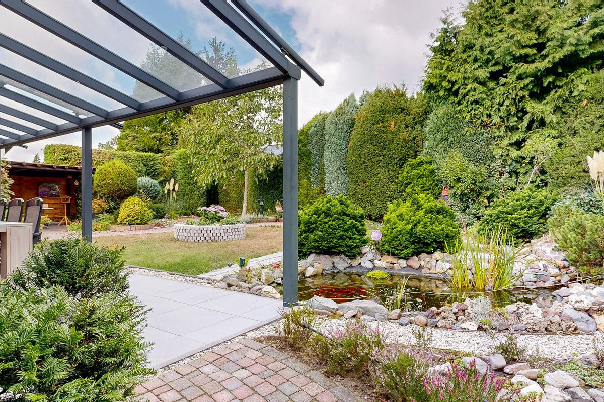 Het landhuis ligt op een hoger gelegen perceel en heeft een voortuin waar een tuinarchitect het ontwerp voor verzorgde. Aan de linkerzijde is toegang tot de inpandige garage en leidt een trappartij omhoog naar de overdekte entree. In de linkerzijtuin is ruimte voor een eigen moestuin; de rechterzijtuin heeft een overkapping die de stalling van de containers aan het directe zicht onttrekt. Hier is ook de ingang van de aangebouwde en geïsoleerde houten berging (10,0 m2) die is voorzien van dak- en muurisolatie en beschikt over aansluitingen van water en elektriciteit. De achtertuin kent een hoge mate van privacy, met name dankzij de hoge en strakgesnoeide coniferenhaag op de achterste erfgrens. In de tuin bevinden zich diverse ronde en rechthoekige terrasjes en een vijverpartij met waterval. Aan de linkerzijde staat een overkapping boven een terras (12,0 m2) en aan de woningzijde is in 2017 een glazen terrasoverkapping (23,0 m2) met ledverlichting aangebouwd die in 2020 is voorzien van elektrisch bedienbare zonwering (2- delig).
