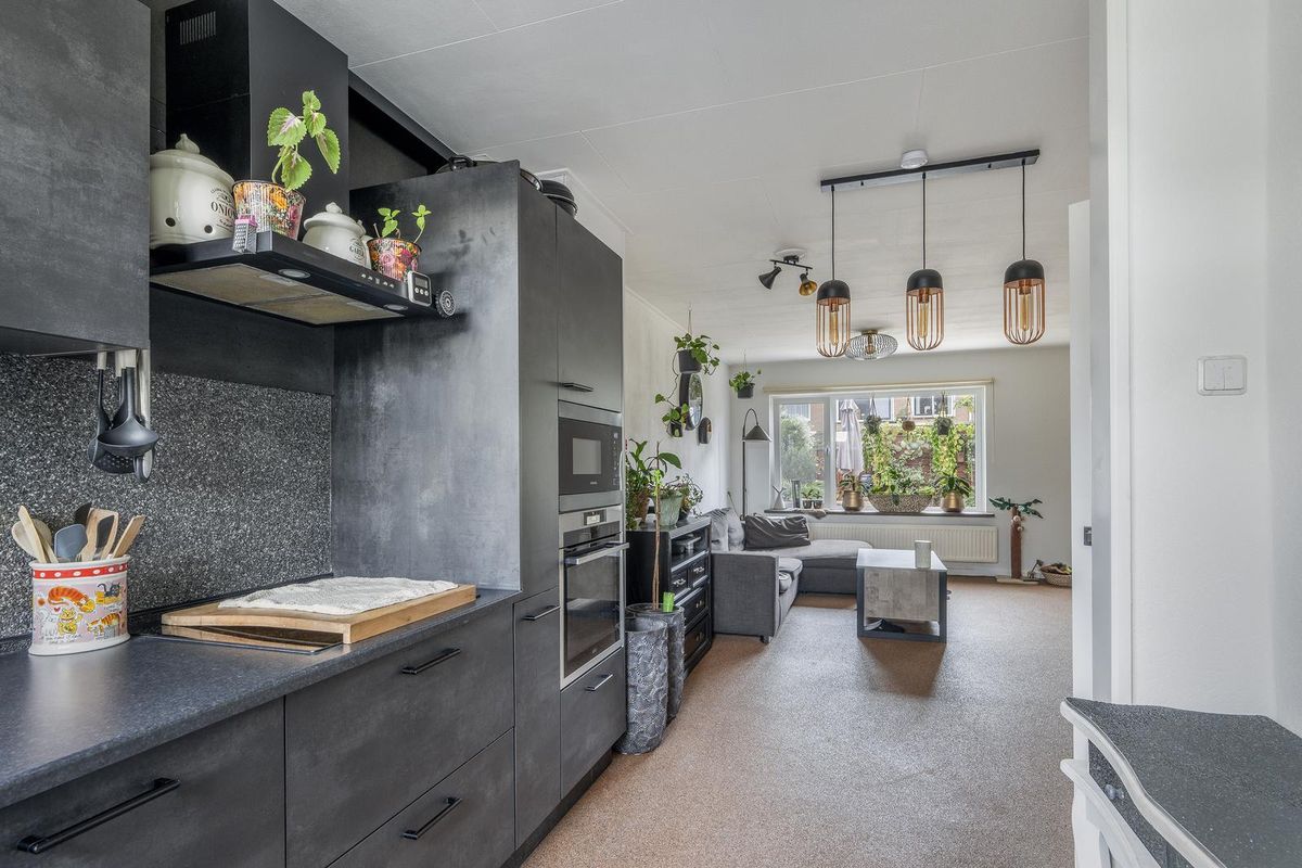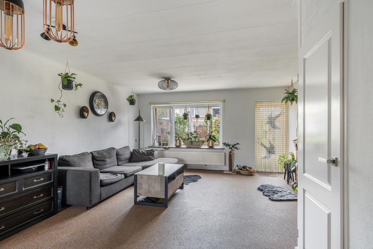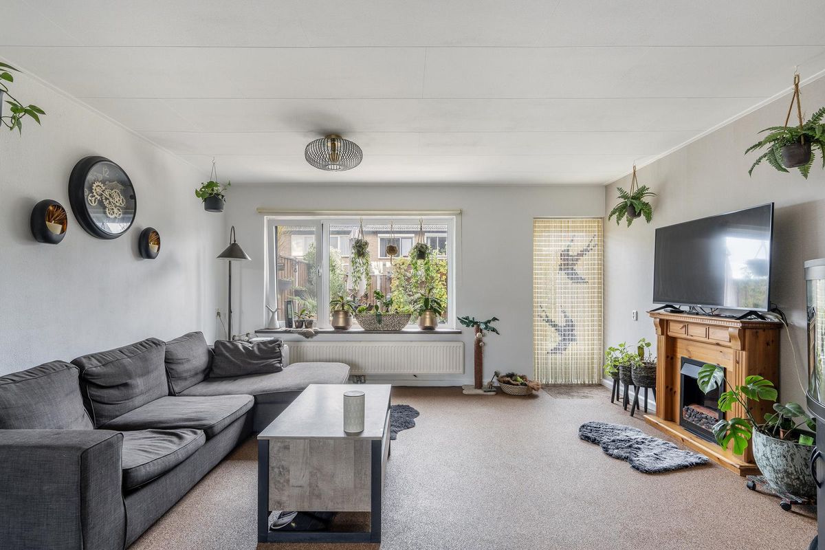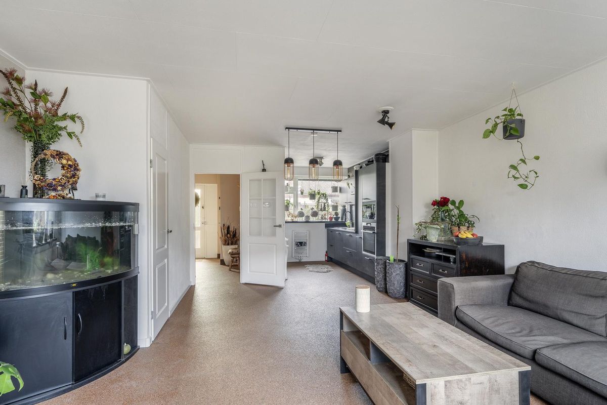 Heerlijke ruime, tuingerichte woonkamer met een deur naar de tuin. Het kozijn aan de achterzijde is vernieuwd, met nu een kunststof kozijn met hor. Onder de trap is een handige provisiekast aanwezig.