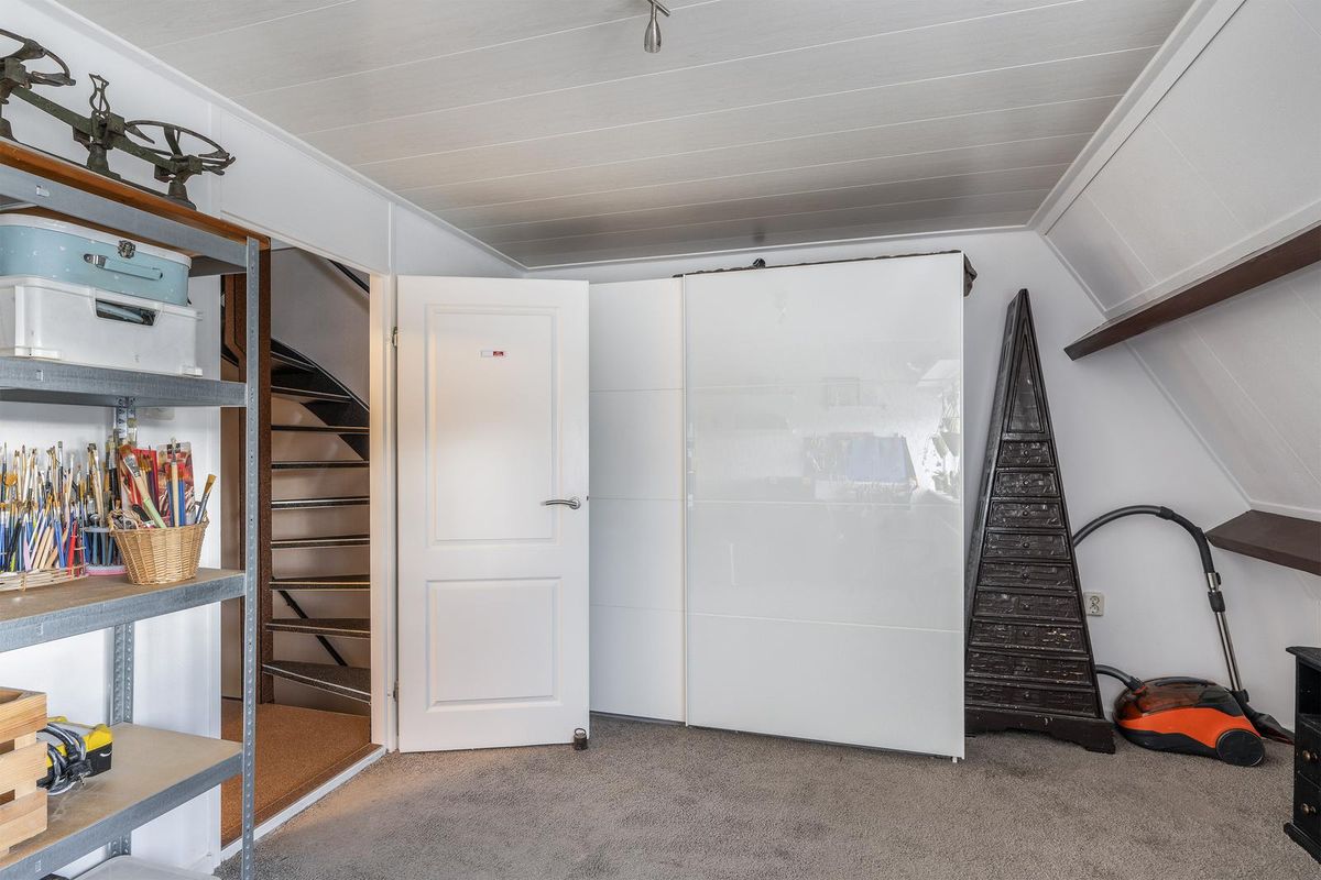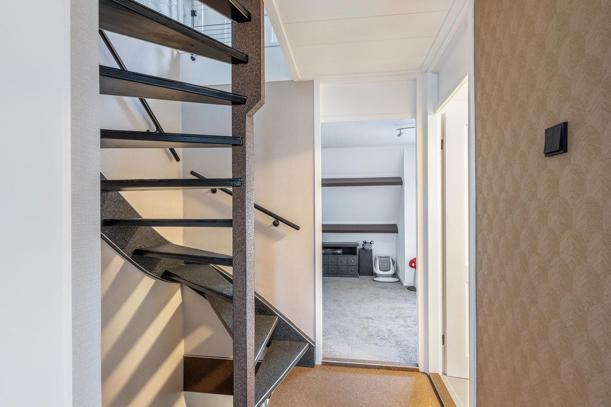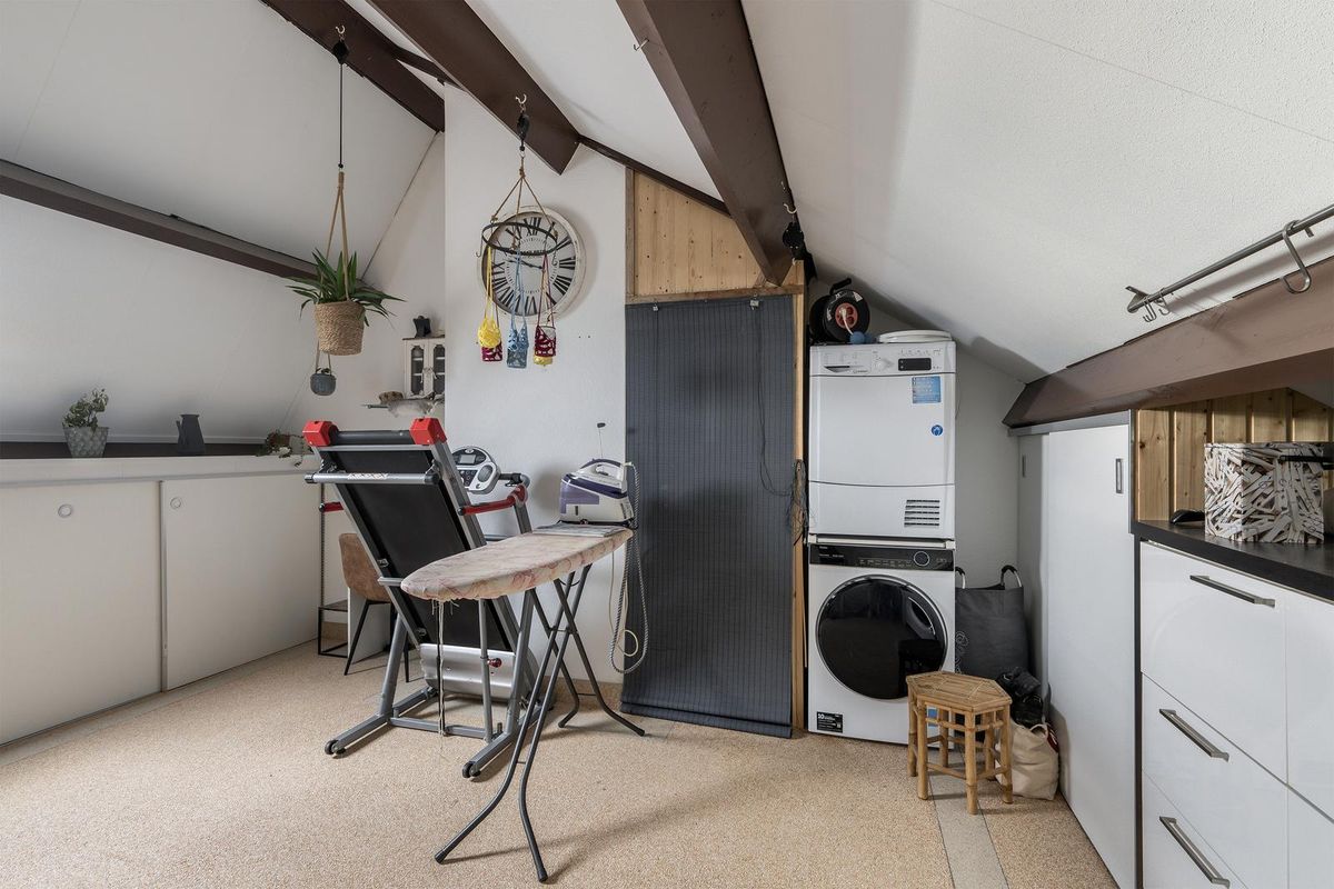 Vaste trap naar de 2e verdieping, waar desgewenst een 4e slaapkamer kan worden gecreëerd. Je vindt hier de CV-combiketel (Remeha Avanta Ace 28c, 2022) en de opstelplaats voor de wasmachine en droger. Aan de voorzijde is een dakraam geplaatst en er zijn, aan de voor- en achterzijde, bergkasten gerealiseerd, welke voorzien zijn van roeden: één grote kledingkast dus! Ook hier is de vloer afgewerkt met een design marmer grind vloer.