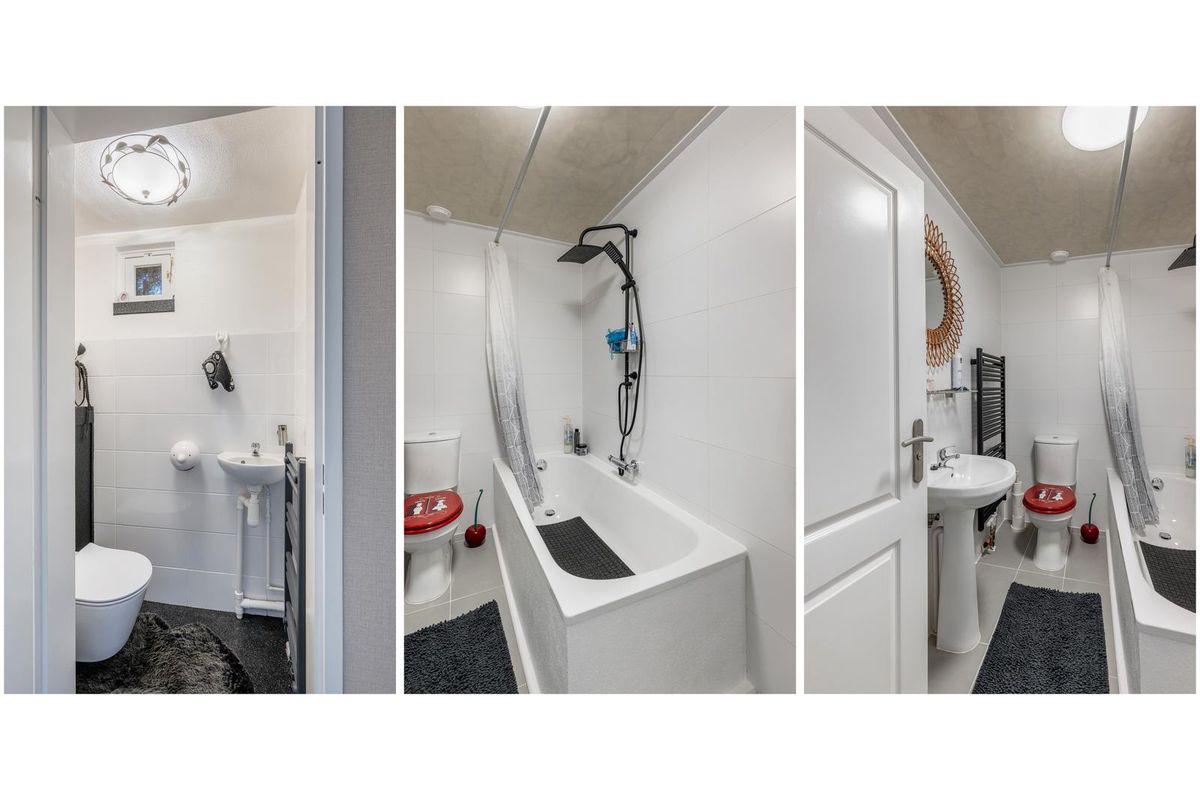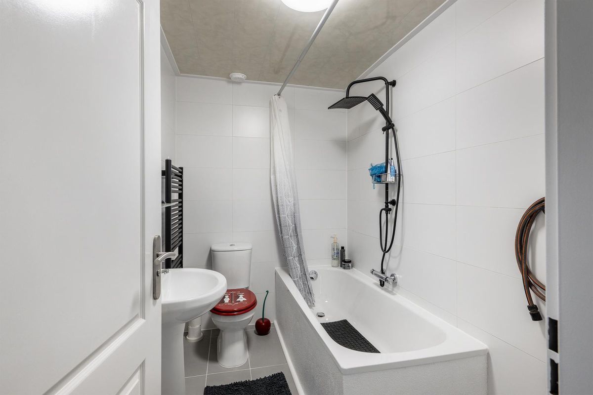 Nette badkamer met ligbad, 2e toilet, wastafel en designradiator.