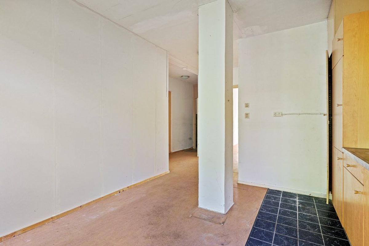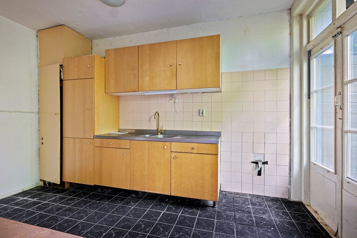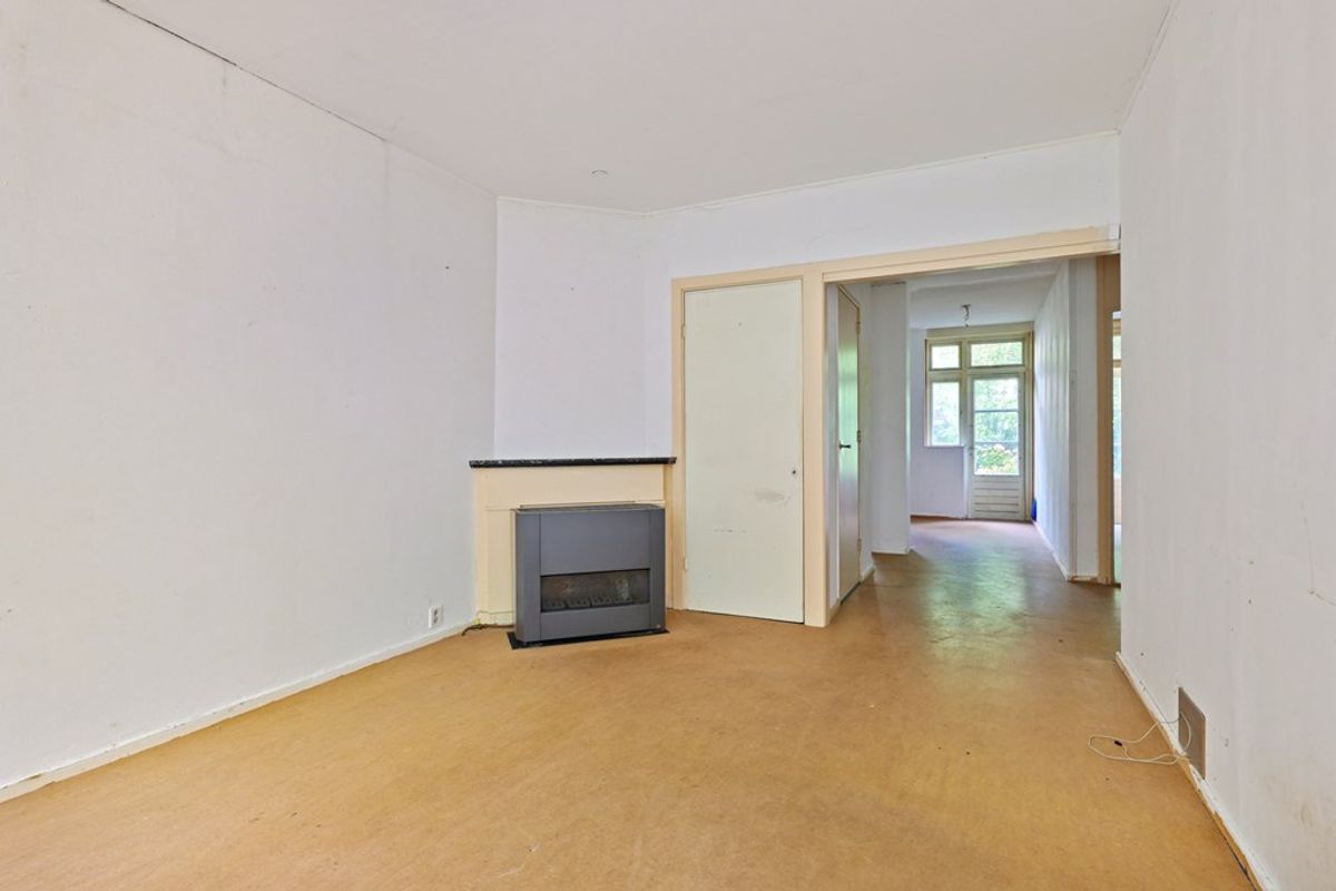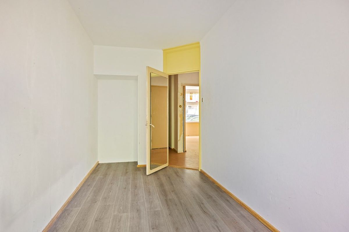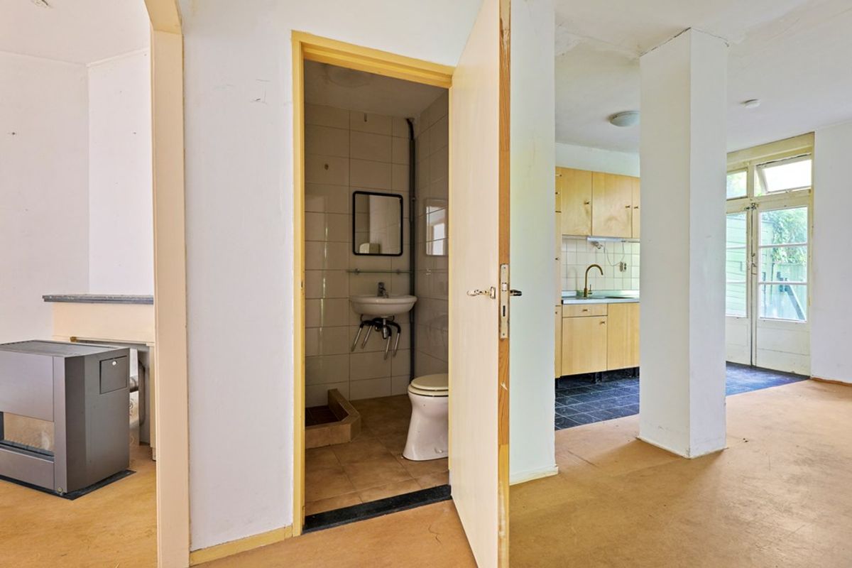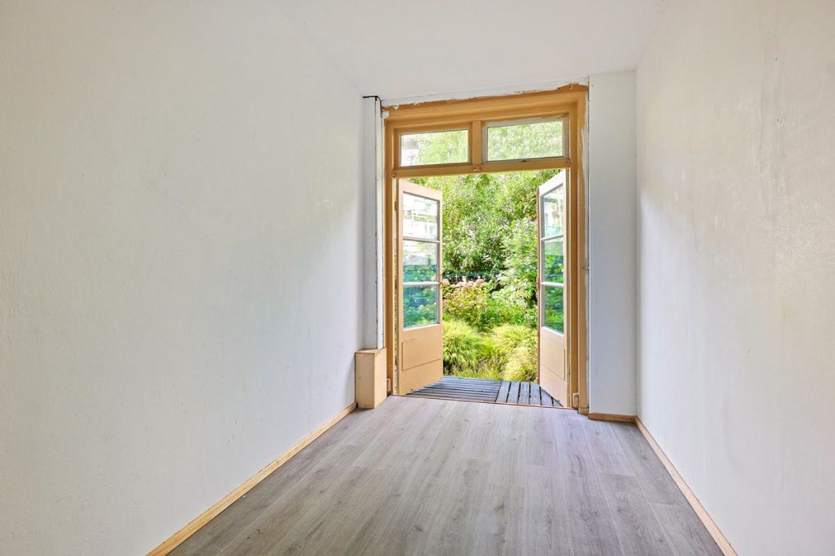 De lichte woonkamer aan de voorzijde biedt voldoende ruimte voor een gezellige zithoek en staat in directe verbinding met de open keuken. Deze is eenvoudig en biedt volop mogelijkheden om geheel naar eigen smaak te moderniseren. Aan de achterzijde bevindt zich de slaapkamer met openslaande deuren naar de tuin – een fijne plek om de dag te beginnen of tot rust te komen.