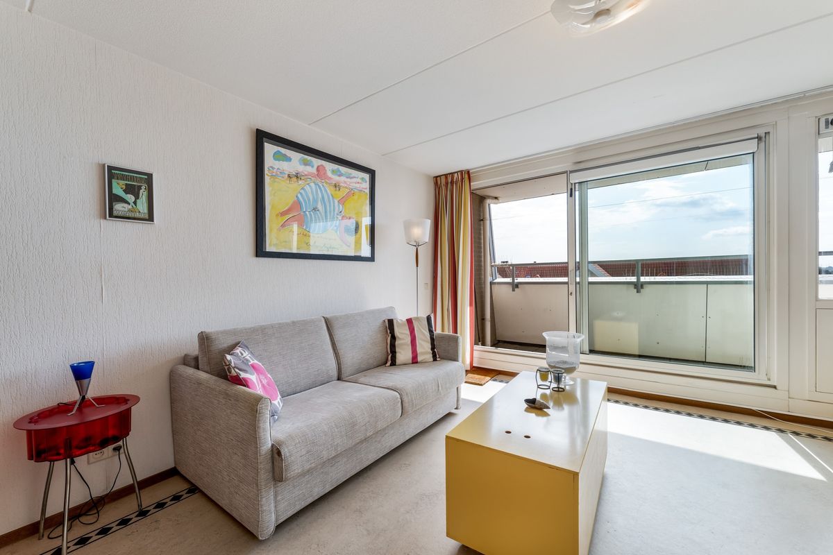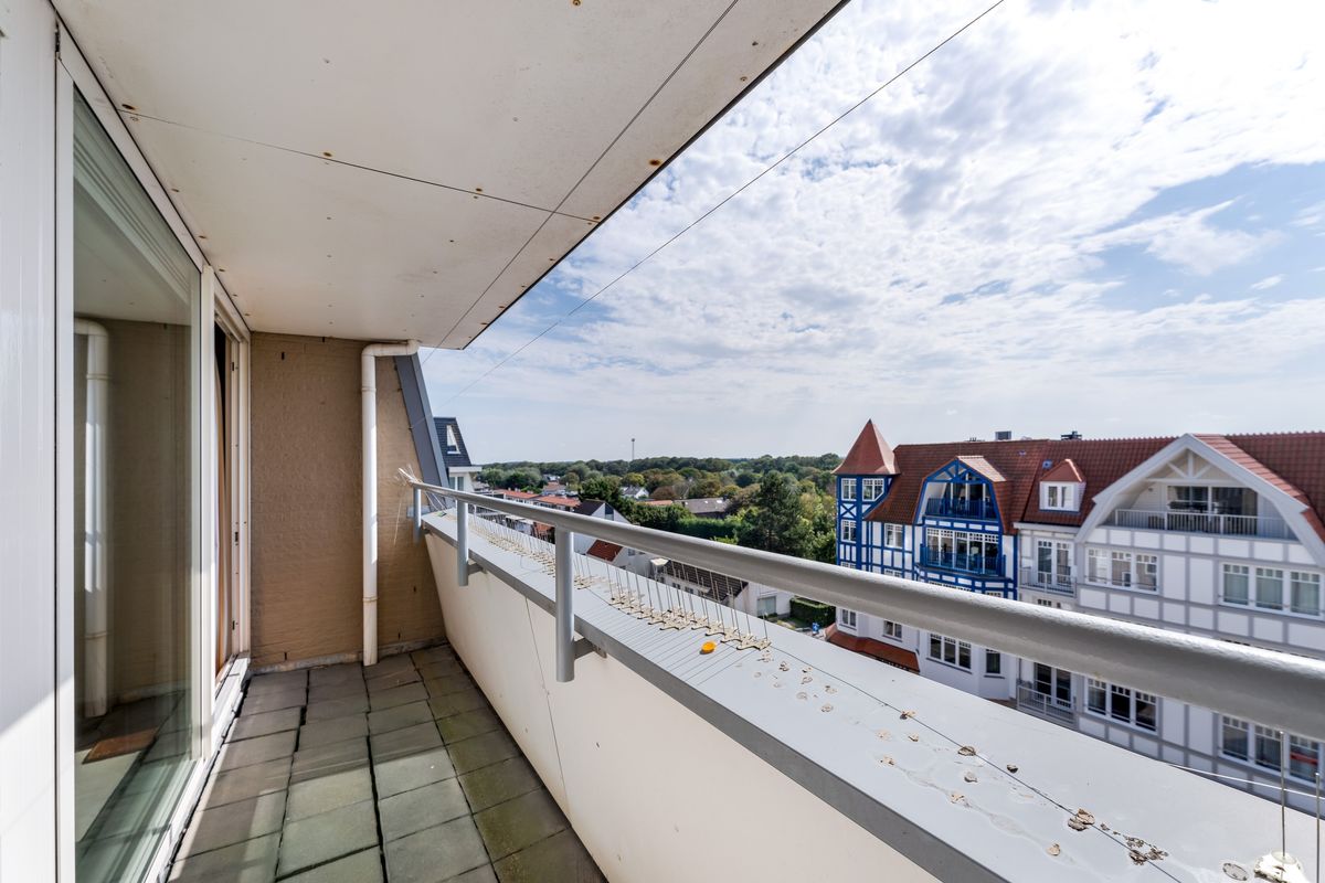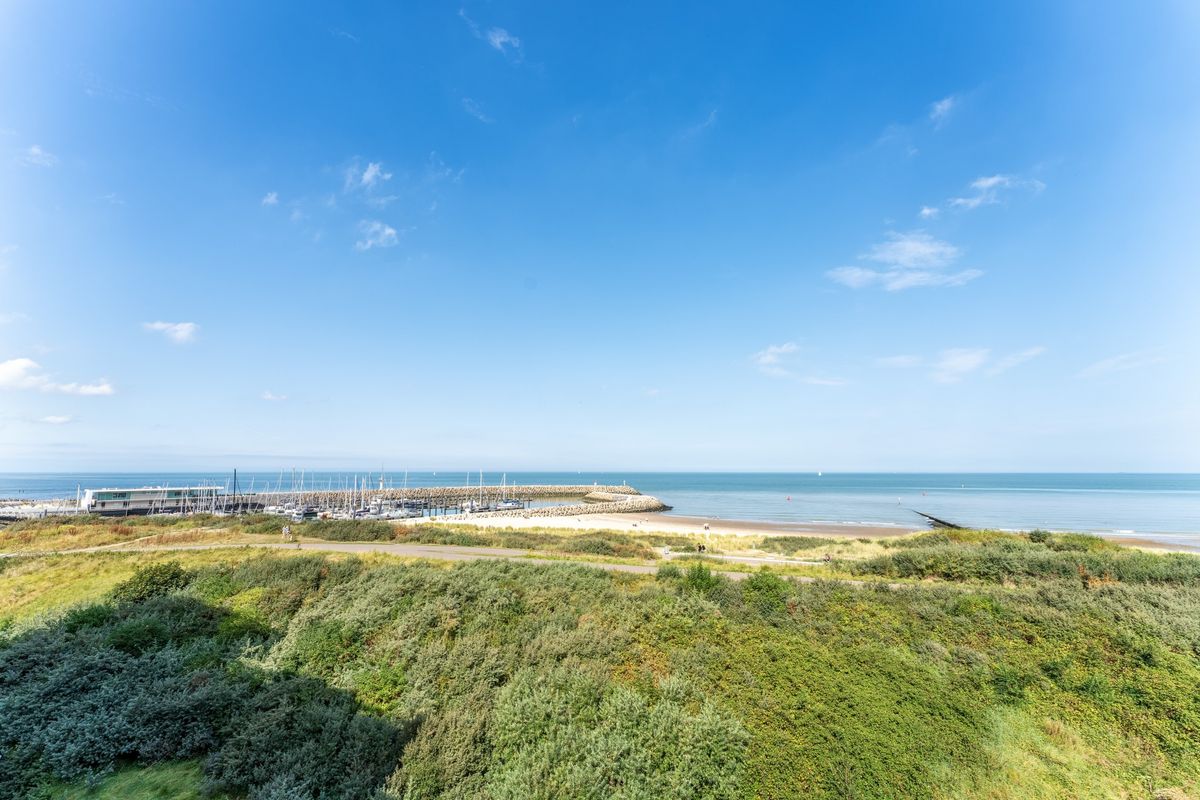 Het appartement beslaat twee volwaardige verdiepingen met vier slaapkamers, twee badkamers, een zonnig balkon én een royaal dakterras met frontaal zeezicht. De living met erker biedt een ongeëvenaard panorama over duinen, strand en water — een uitzicht dat nooit verveelt, elk seizoen anders is en in de avond baadt in het warme licht van de ondergaande zon.