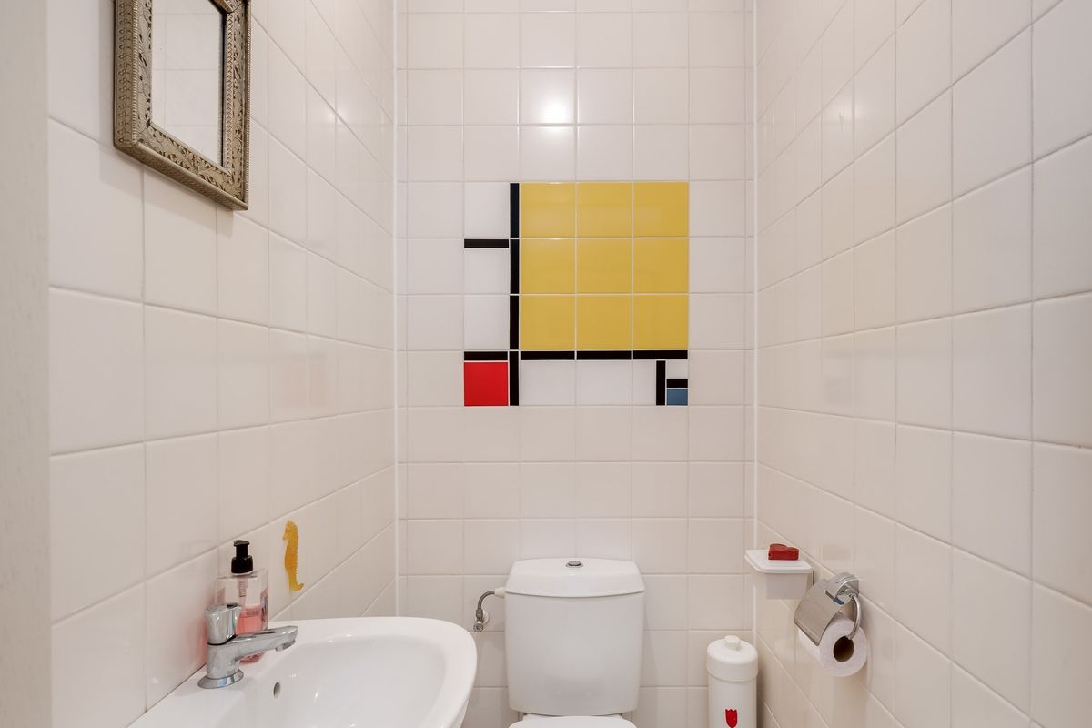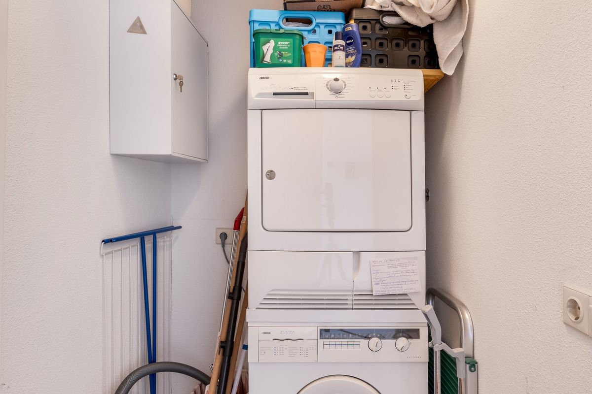 Grenzend aan de hal bevindt zich een gastentoilet, een meterkast en een handige berging met aansluitingen voor wasmachine en droger.