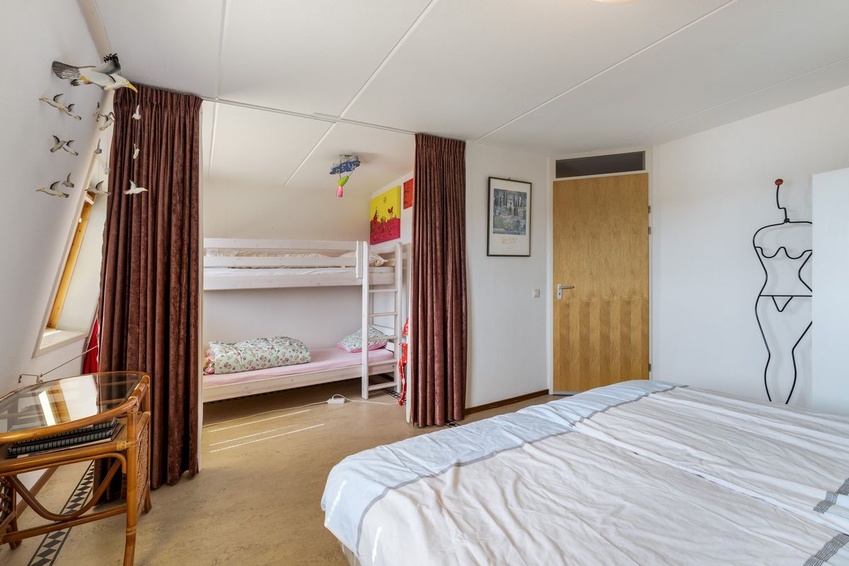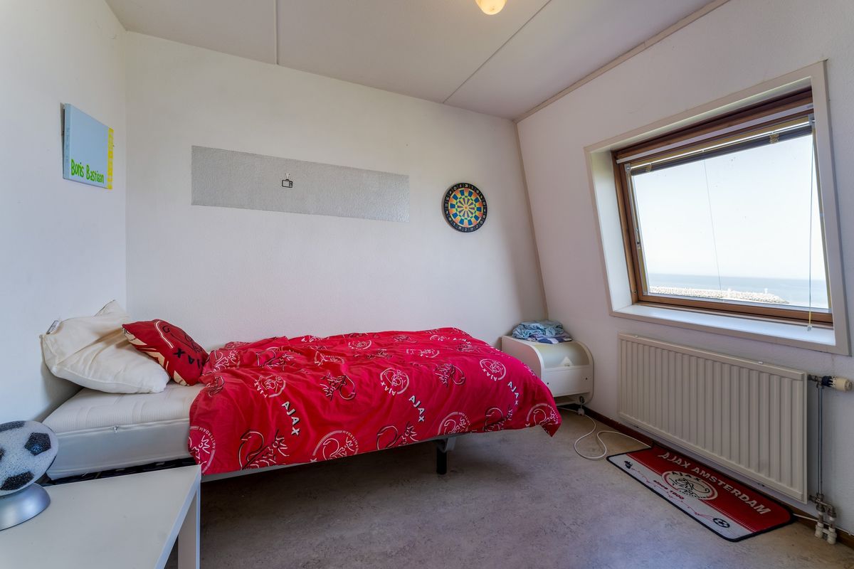 Twee slaapkamers beschikken over grote dakramen die uitkijken over de zee en het duinlandschap – ontwaken met uitzicht op het water wordt hier vanzelfsprekend.