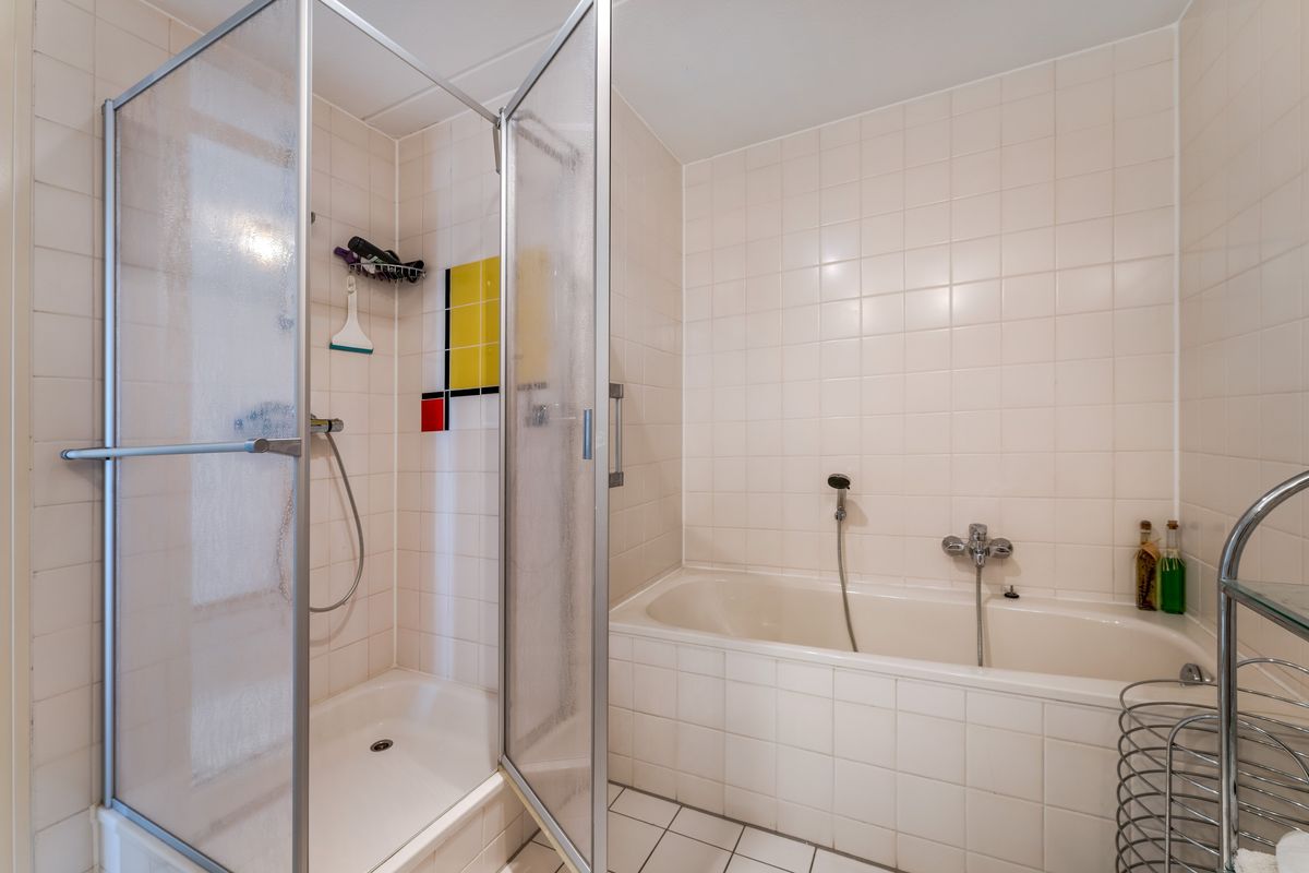 Aan de rustige achterzijde bevindt zich de eerste slaapkamer, met aangrenzende badkamer en suite. De badkamer is uitgerust met een ligbad, douche en dubbele wastafel, ideaal voor comfort en privacy op de woonverdieping. Vanuit deze slaapkamer stap je via een schuifpui direct het zuid/zuidoost georiënteerde balkon op – een heerlijke plek om te ontbijten in de zon of te kijken naar de levendigheid van de boulevard.