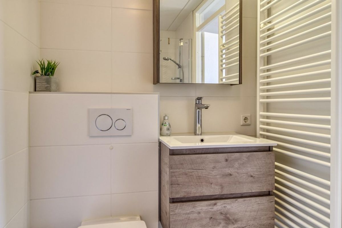 De open keuken is voorzien van inbouwapparatuur en heeft; 4-pits gaskookplaat, afzuigkap, spoelbak, koelkast met vriesvak, combi-magnetron en vaatwasmachine.