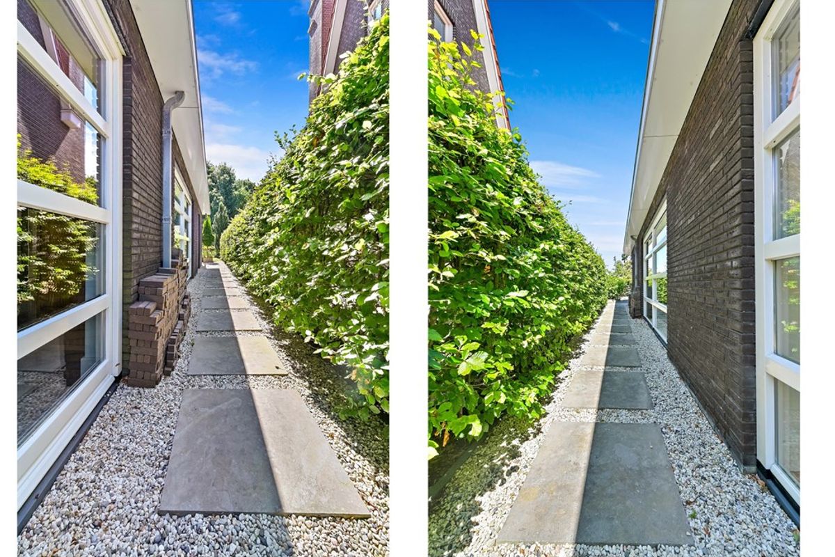 Via de verzorgd aangelegde voortuin met meerdere parkeerplaatsen en laadpaal op eigen terrein bereikt u de garage en hoofdentree van de woning aan de zijkant. Bij binnenkomst ervaart u direct een luxe sfeer door de aanwezigheid van een ruim opgezette hal met statige trap, indrukwekkende vide en grote raampartijen. In de hal vindt u de meterkast, garderobe en de moderne toiletruimte naast de voordeur welke is voorzien van een wandcloset en fonteintje. De dubbele deuren brengen u vanuit de hal naar de zeer royale living met open woonkeuken aan de voorzijde. De luxe, moderne keuken met kastenwand en kook-/spoeleiland van het merk Arclinea is uitgerust met een RVS werkblad met geïntegreerde spoelbak en vijfpits gaskookplaat en hoogwaardige inbouwapparatuur, waaronder een ingebouwde RVS afzuigkap, oven, koel-vrieskast, combi-stoom-oven, koffieautomaat, twee warmhoudlades en vaatwasser. Achter de keuken bevindt zich een praktische bijkeuken welke tevens te bereiken is via een deur in de zijgevel. In deze bijkeuken vindt u naast de diverse opbergmogelijkheden een spoelbak, extra koelkast en vriezer. De zeer royale L-vormige woonkamer is aan de achterzijde en zijkant van de woning gesitueerd. De woonkamer biedt voldoende plek voor een zeer ruime zithoek en grote eettafel, welke momenteel tussen de woonkamer en de keuken te vinden is. Dankzij de grote raampartijen in de zijgevel komt er van drie zijden licht de woning binnen. De royale schuifpui in de achtergevel biedt toegang tot de schitterende, op het zuiden georiënteerde achtertuin. De achtertuin is onder architectuur aangelegd en voorzien van onder andere een onderheid terras, elektrisch bedienbaar zonnescherm, drainagesysteem, buitenkraan en tuinverlichting. In de achtertuin zijn meerdere terrassen te vinden waardoor u gedurende de dag altijd wel een plekje in de zon (en schaduw) kunt vinden. De achtertuin grenst via een watergang aan het Maaslandse Bos, waardoor u heel veel privacy in de tuin zult ervaren. Vanuit de achtertuin is tevens de garage te bereiken. In de garage vindt u onder andere elektra, verlichting, op maat gemaakte kasten en dubbele deuren naar de oprit aan de voorzijde. Ook is er in de garage een 220 grondkabel aanwezig, welke naar de achtertuin is doorgetrokken. De garage is een ideale plek voor het opbergen van uw spullen of bijvoorbeeld het stallen van de fietsen van het gehele gezin.