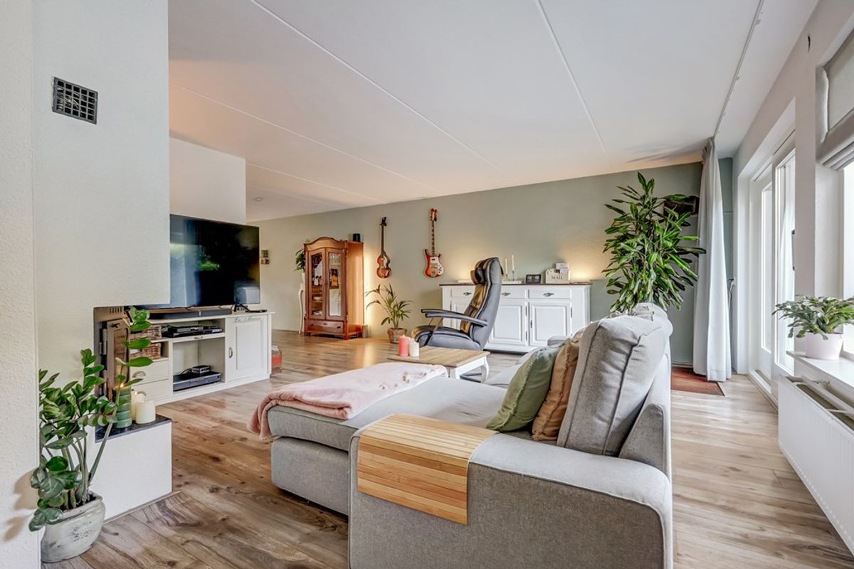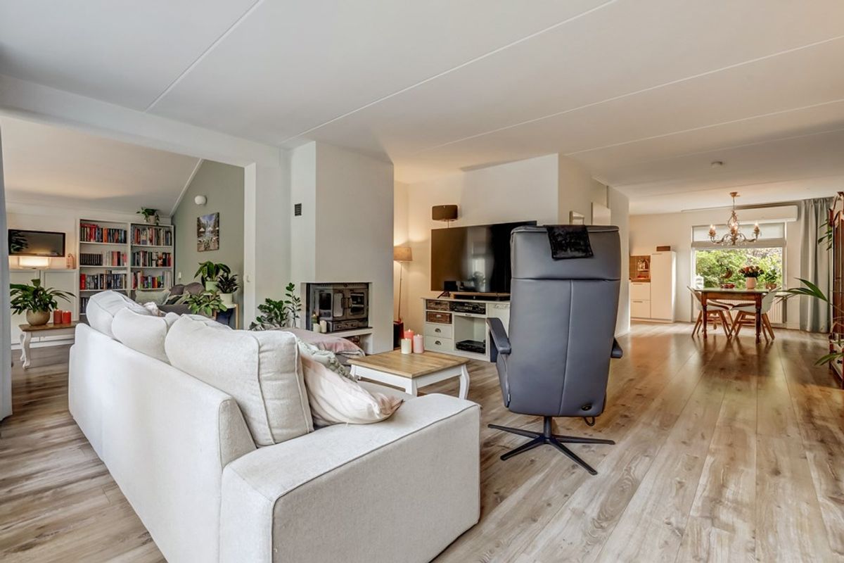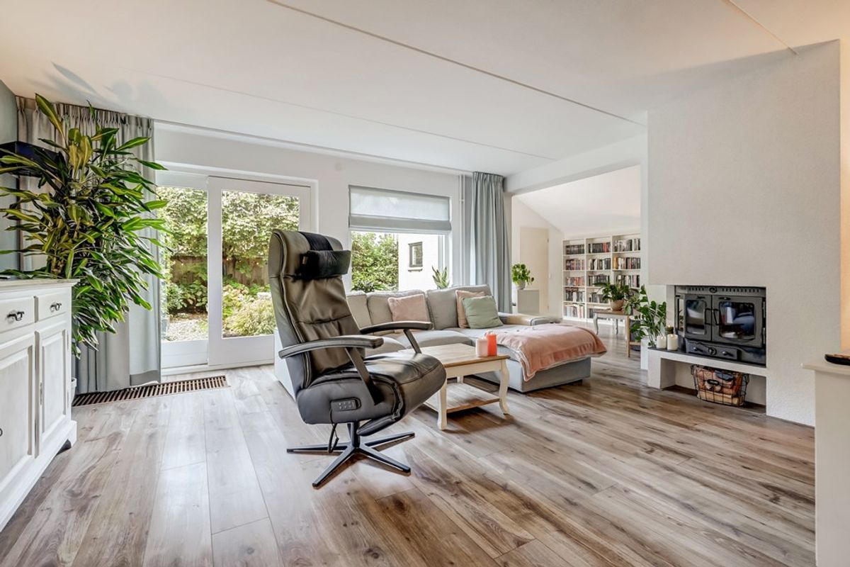 Entree/hal met meterkast, moderne toiletruimte (met fonteintje), trapopgang en toegang tot de woonkamer waar het woonplezier direct begint. De zeer royale living van ca. 53 m² voelt warm en sfeervol aan dankzij de houtkachel en de schuifpui richting de tuin. Doordat een deel van de garage bij de woonkamer is betrokken, is een tweede zithoek ontstaan – ideaal voor een speelplek voor de kinderen, een leeshoek of een comfortabele thuiswerkplek. Aansluitend bevindt zich een hobby-/werkkamer met vliering en een deur naar de achtertuin.